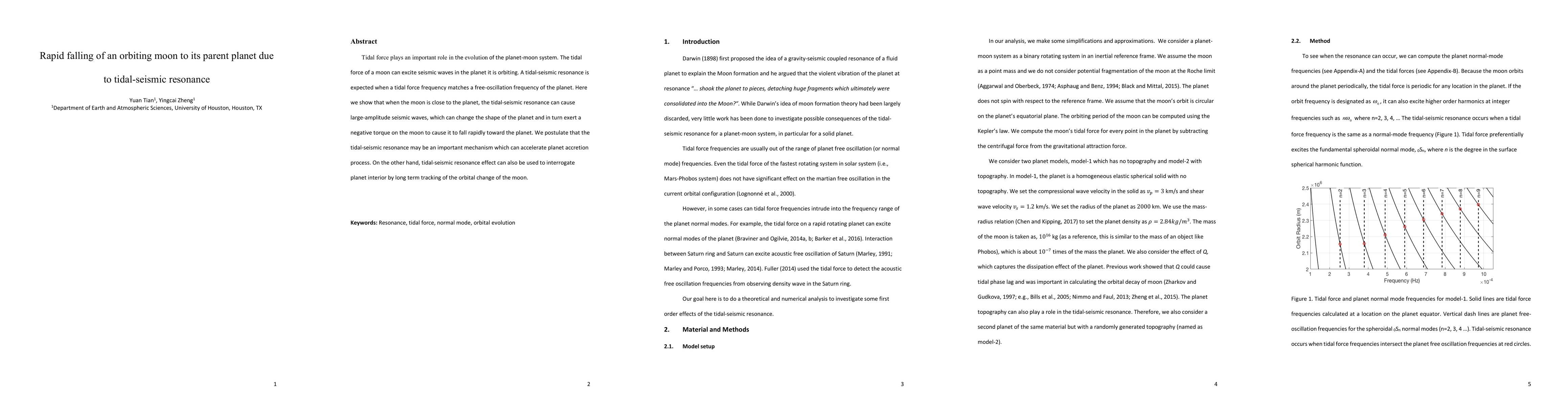This paper investigates how tidal-seismic resonance can cause a moon to rapidly fall towards its parent planet due to large-amplitude seismic waves induced by matching tidal force frequencies with the planet's free-oscillation frequencies. The resonance accelerates the planet accretion process and can be used to probe the planet's interior.