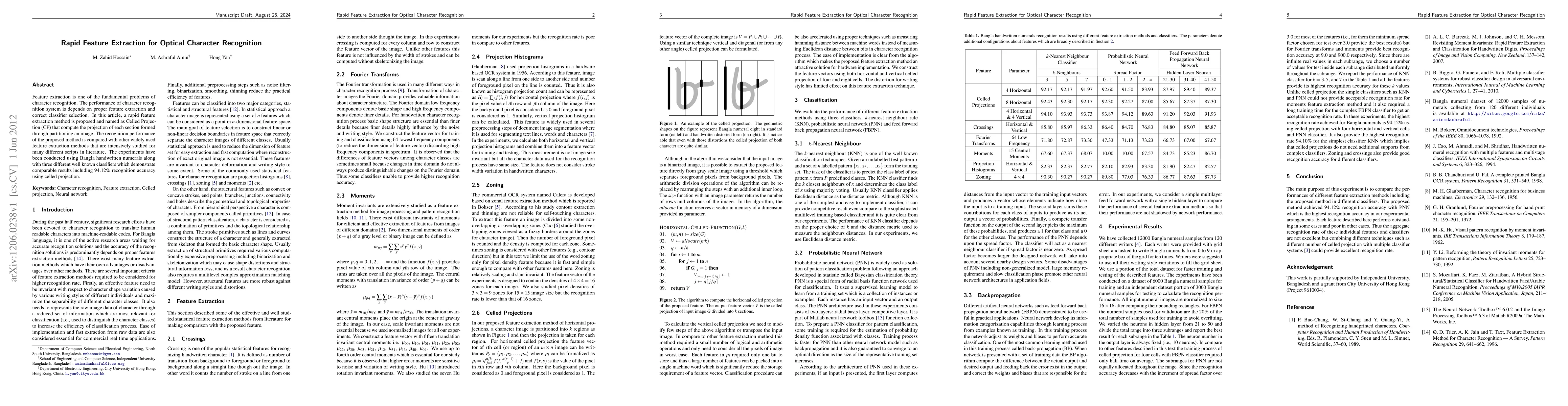 This paper proposes a rapid feature extraction method called Celled Projection (CP) for optical character recognition, which computes projections of partitioned sections in an image. Experiments with Bangla handwritten numerals and three classifiers show comparable results, achieving 94.12% recognition accuracy.