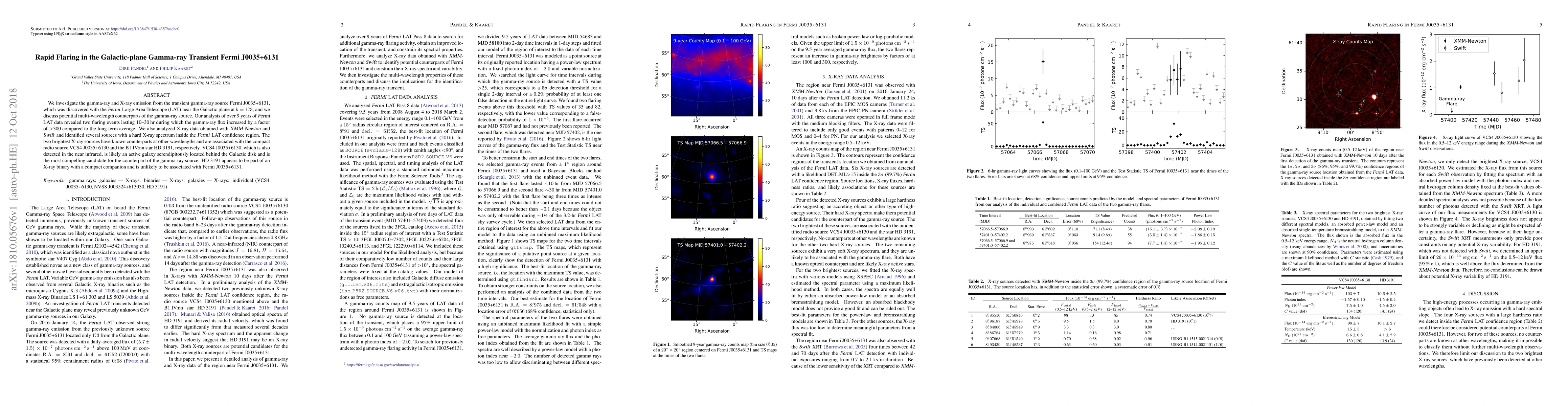 We investigate the gamma-ray and X-ray emission from the transient gamma-ray source Fermi J0035+6131, which was discovered with the Fermi Large Area Telescope (LAT) near the Galactic plane at $b=1.3^\circ$, and we discuss potential multi-wavelength counterparts of the gamma-ray source. Our analysis of over 9 years of Fermi LAT data revealed two flaring events lasting 10-30 hr during which the gamma-ray flux increased by a factor of >300 compared to the long-term average. We also analyzed X-ray data obtained with XMM-Newton and Swift and identified several sources with a hard X-ray spectrum inside the Fermi LAT confidence region. The two brightest X-ray sources have known counterparts at other wavelengths and are associated with the compact radio source VCS4 J0035+6130 and the B1 IV:nn star HD 3191, respectively. VCS4 J0035+6130, which is also detected in the near infrared, is likely an active galaxy serendipitously located behind the Galactic disk and is the most compelling candidate for the counterpart of the gamma-ray source. HD 3191 appears to be part of an X-ray binary with a compact companion and is unlikely to be associated with Fermi J0035+6131.