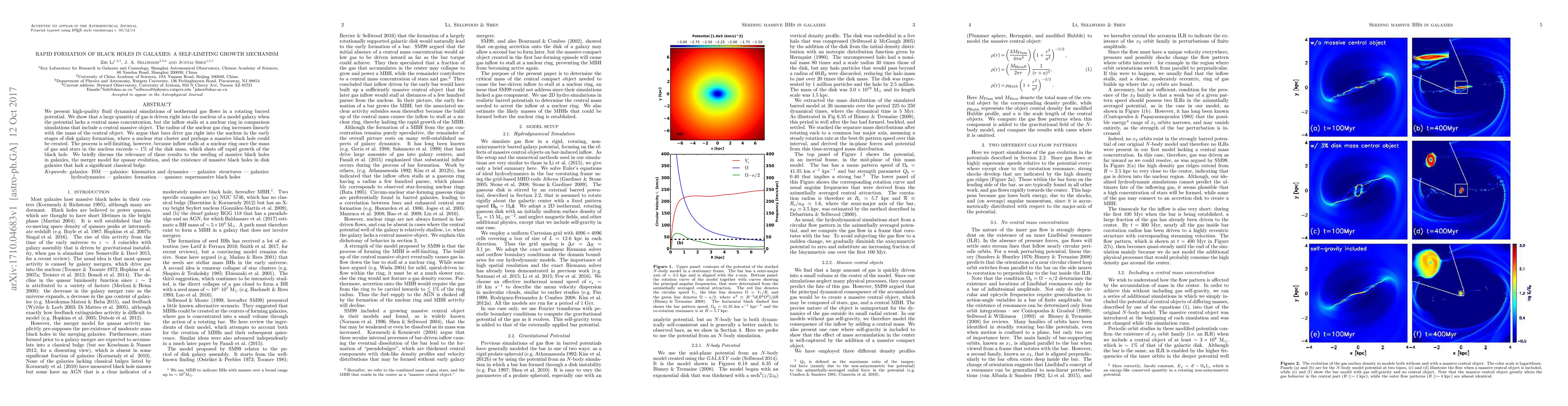 This paper uses fluid dynamical simulations to demonstrate that gas inflows driven by galactic bars can lead to the rapid formation of black holes in the early stages of galaxy formation. The growth of these black holes is self-limiting, as inflows stall once nuclear mass exceeds ~1% of the disk mass, preventing further rapid growth.