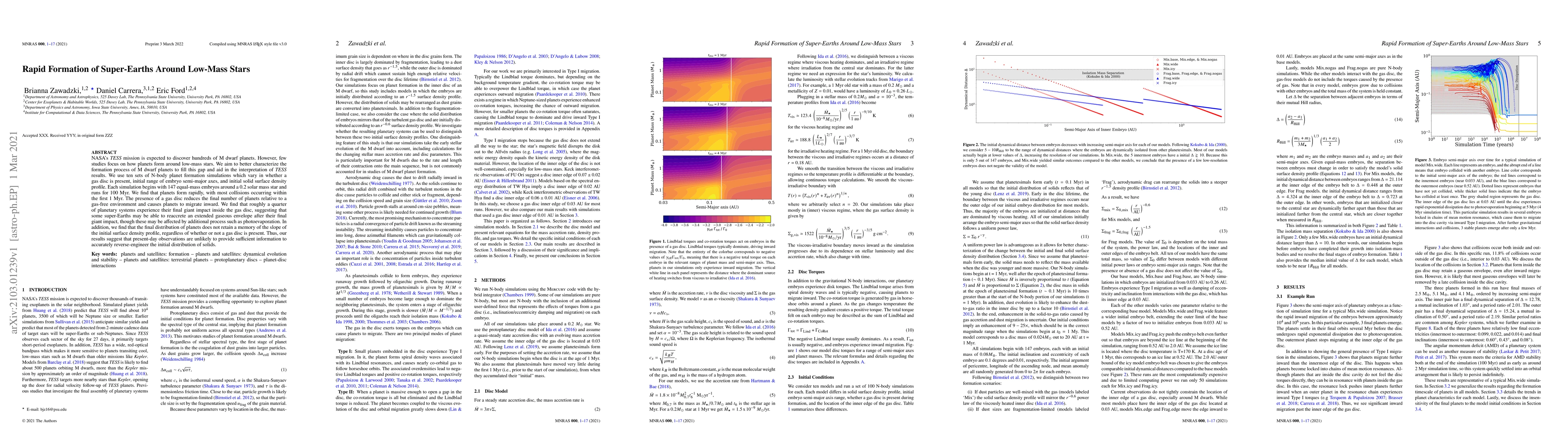 This study investigates the rapid formation of super-Earths around low-mass stars using N-body simulations, finding that most planet formation occurs within the first year. The presence of a gas disc reduces the final number of planets and causes inward migration, potentially allowing some super-Earths to reaccrete gas after their final giant impact.