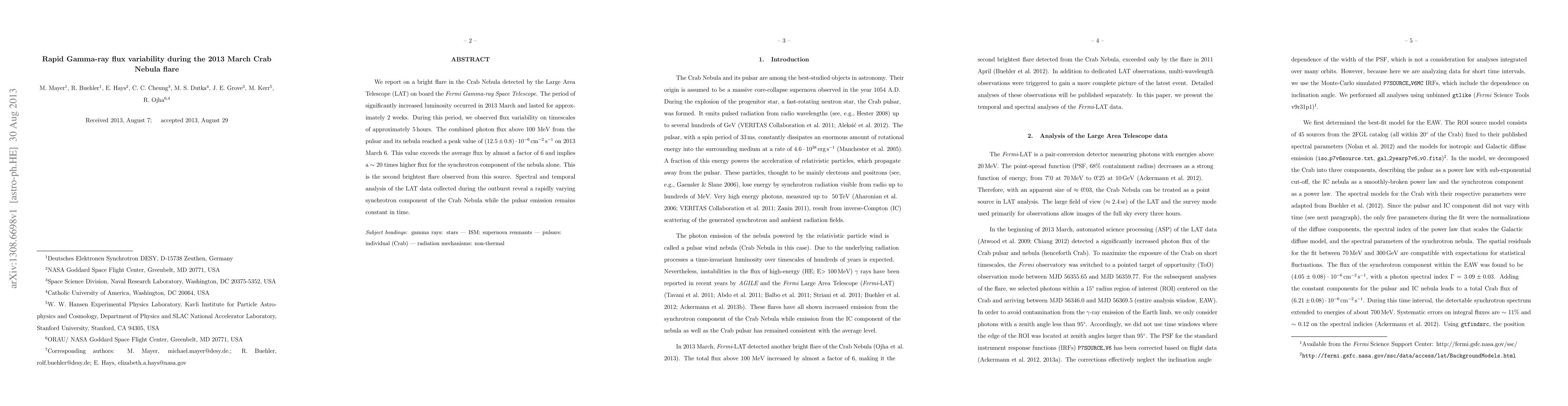 This paper reports on a significant gamma-ray flare from the Crab Nebula detected by the Fermi Gamma-ray Space Telescope in March 2013, showing flux variability on 5-hour timescales. The peak flux was nearly six times the average, indicating a 20-fold increase in the synchrotron component of the nebula, with the pulsar emission remaining stable.