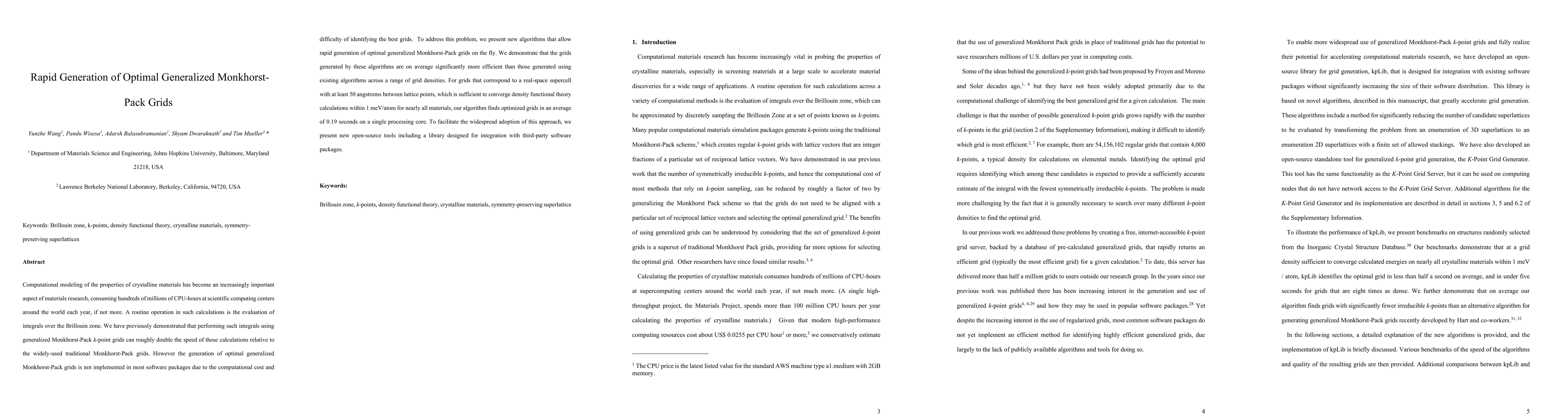This paper presents new algorithms for rapidly generating optimized generalized Monkhorst-Pack k-point grids, which can significantly speed up computational modeling of crystalline materials. The algorithms achieve near-optimal grid generation in seconds, enabling efficient integration into external software packages.