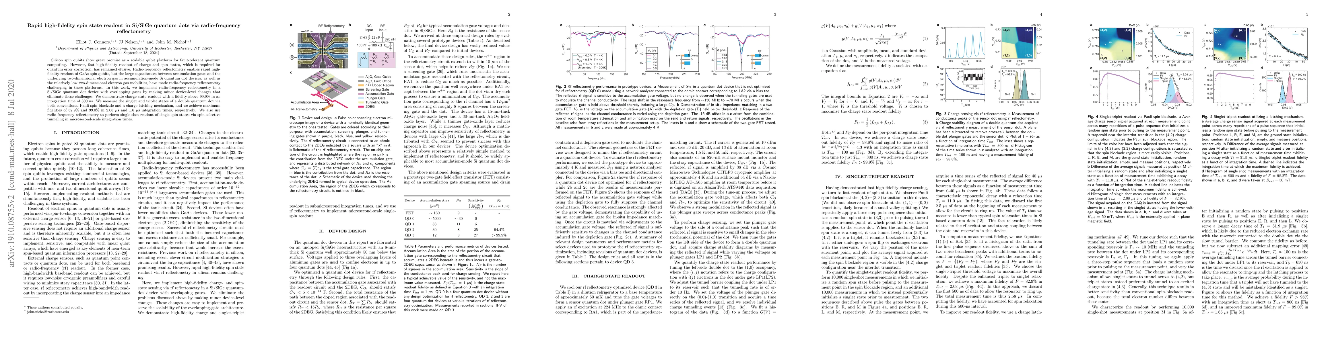 This paper presents a method for rapid high-fidelity spin state readout in Si/SiGe quantum dots using radio-frequency reflectometry, overcoming previous challenges due to device resistances and capacitances. The technique achieves charge state readout fidelity above 99.9% in 300 ns and demonstrates spin state readout with fidelities of up to 99.0% in microsecond-scale integration times.