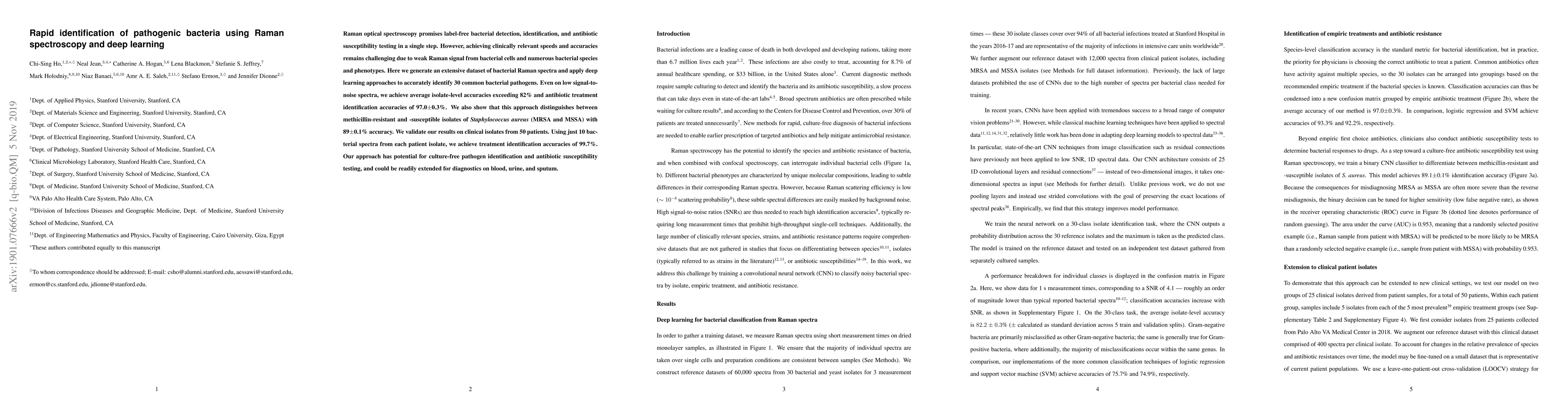 This paper presents a deep learning approach using Raman spectroscopy to rapidly identify 30 common bacterial pathogens, achieving 99.0% accuracy, and distinguishing between antibiotic-resistant and -susceptible strains. Initial clinical validation shows promising results, suggesting potential for culture-free diagnostics in various bodily fluids.