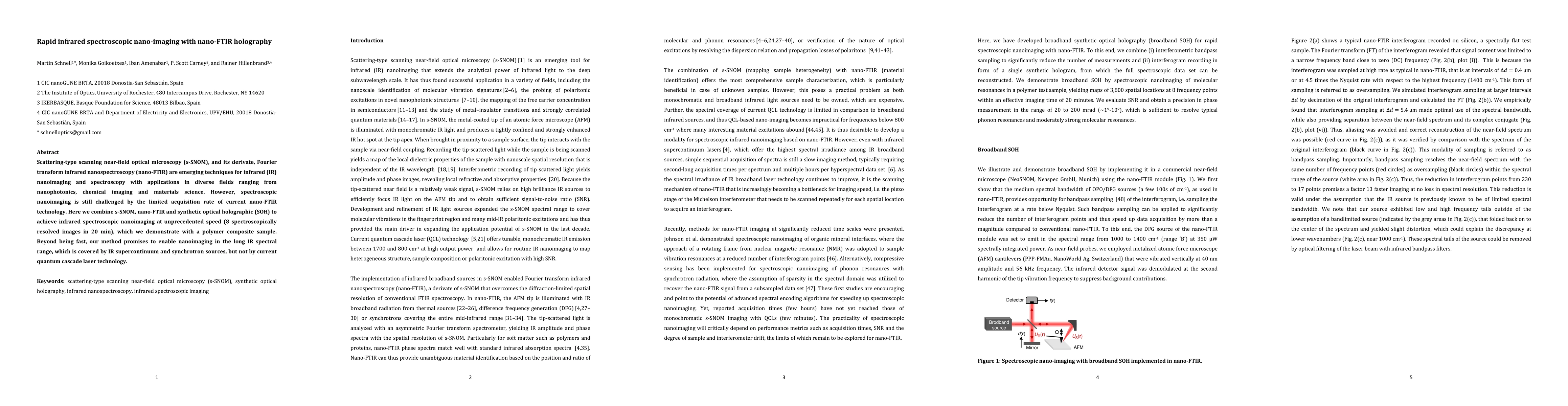 This paper presents a novel method combining scattering-type scanning near-field optical microscopy, nano-FTIR, and synthetic optical holography to achieve rapid infrared nanoimaging at a speed of 8 spectroscopically resolved images in 20 minutes, significantly improving the acquisition rate of current nano-FTIR technology. The method also extends the capability for imaging in the long IR spectral range.