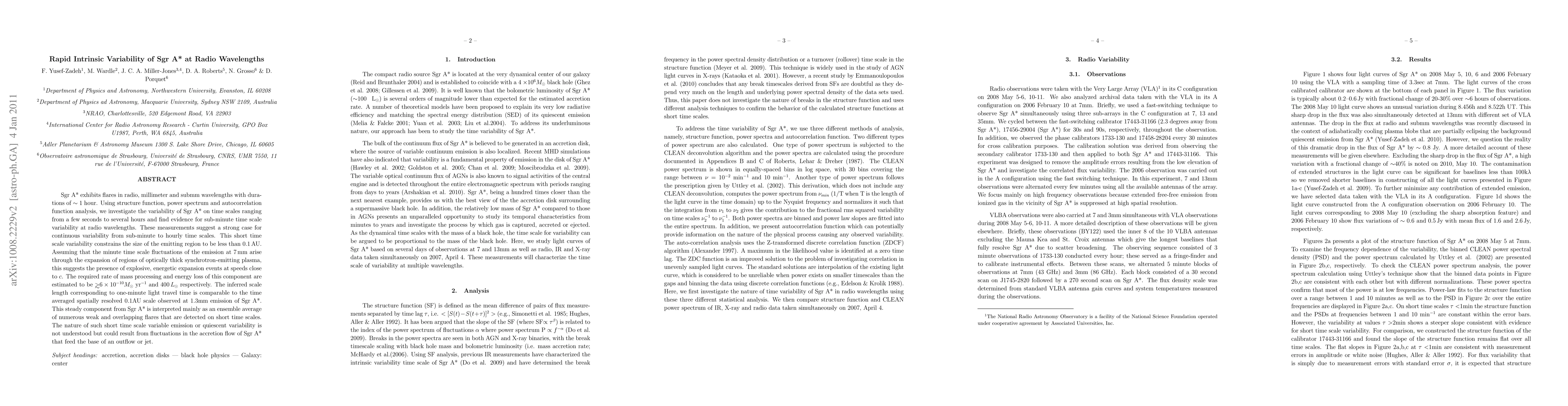 Sgr A* exhibits flares in radio, millimeter and submm wavelengths with durations of $\sim 1$ hour. Using structure function, power spectrum and autocorrelation function analysis, we investigate the variability of Sgr A* on time scales ranging from a few seconds to several hours and find evidence for sub-minute time scale variability at radio wavelengths. These measurements suggest a strong case for continuous variability from sub-minute to hourly time scales. This short time scale variability constrains the size of the emitting region to be less than 0.1\,AU. Assuming that the minute time scale fluctuations of the emission at 7\,mm arise through the expansion of regions of optically thick synchrotron-emitting plasma, this suggests the presence of explosive, energetic expansion events at speeds close to $c$. The required rate of mass processing and energy loss of this component are estimated to be $\ga 6\times 10^{-10} \msol$ yr$^{-1}$ and 400\,$L_\odot$ respectively. The inferred scale length corresponding to one-minute light travel time is comparable to the time averaged spatially resolved 0.1AU scale observed at 1.3mm emission of Sgr A*. This steady component from Sgr A* is interpreted mainly as an ensemble average of numerous weak and overlapping flares that are detected on short time scales. The nature of such short time scale variable emission or quiescent variability is not understood but could result from fluctuations in the accretion flow of Sgr A* that feed the base of an outflow or jet.