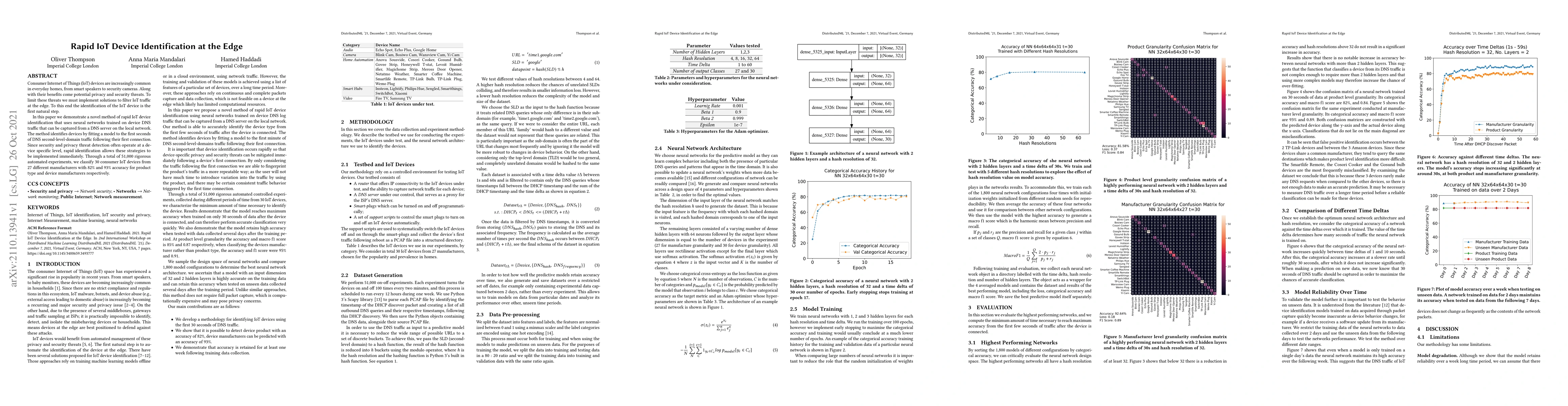 Consumer Internet of Things (IoT) devices are increasingly common in everyday homes, from smart speakers to security cameras. Along with their benefits come potential privacy and security threats. To limit these threats we must implement solutions to filter IoT traffic at the edge. To this end the identification of the IoT device is the first natural step. In this paper we demonstrate a novel method of rapid IoT device identification that uses neural networks trained on device DNS traffic that can be captured from a DNS server on the local network. The method identifies devices by fitting a model to the first seconds of DNS second-level-domain traffic following their first connection. Since security and privacy threat detection often operate at a device specific level, rapid identification allows these strategies to be implemented immediately. Through a total of 51,000 rigorous automated experiments, we classify 30 consumer IoT devices from 27 different manufacturers with 82% and 93% accuracy for product type and device manufacturers respectively.