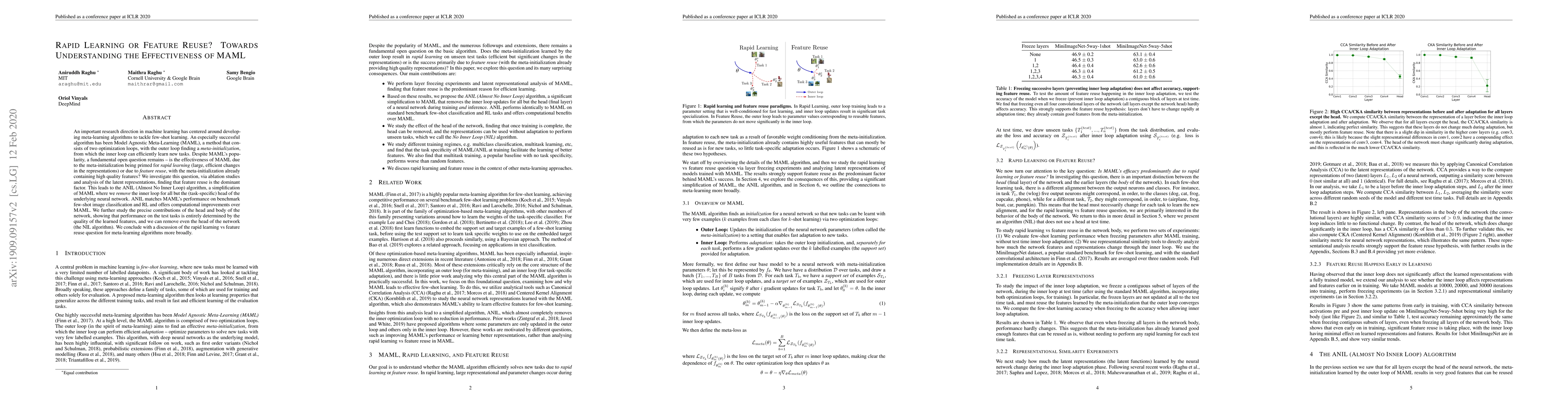 This paper investigates whether the effectiveness of MAML in few-shot learning stems from rapid learning or feature reuse. It finds that feature reuse is the dominant factor, leading to the development of the ANIL algorithm, which simplifies MAML by removing the inner loop, achieving comparable performance with computational benefits.