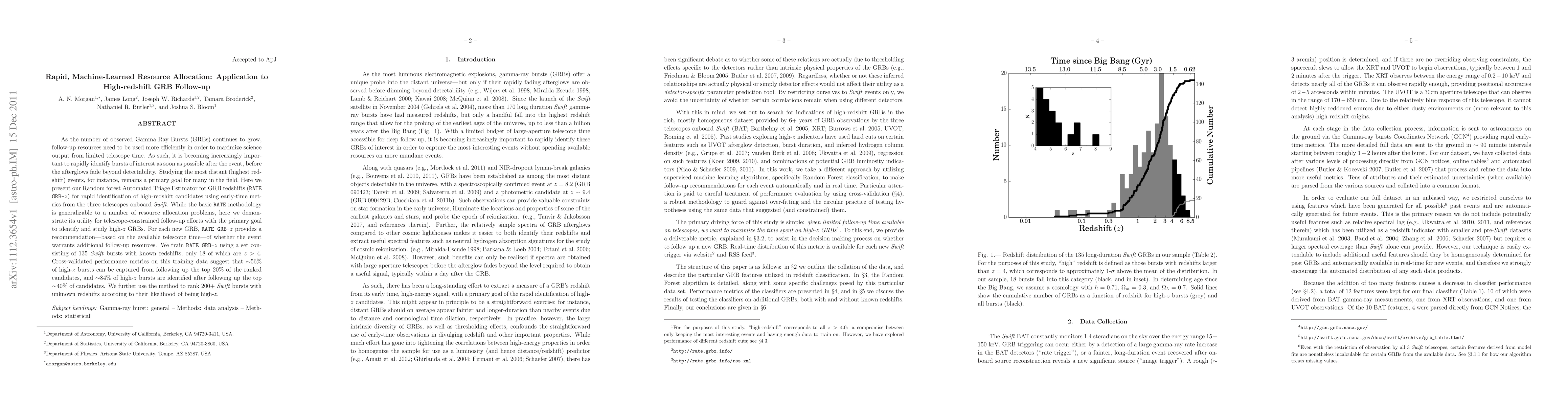 This paper introduces a machine-learned Random Forest Automated Triage Estimator (RATE GRB-z) for rapidly identifying high-redshift Gamma-Ray Bursts (GRBs) using early-time metrics from Swift telescopes. The method aims to optimize telescope resource allocation by prioritizing follow-up efforts on the most promising candidates, thereby maximizing the study of distant GRBs.