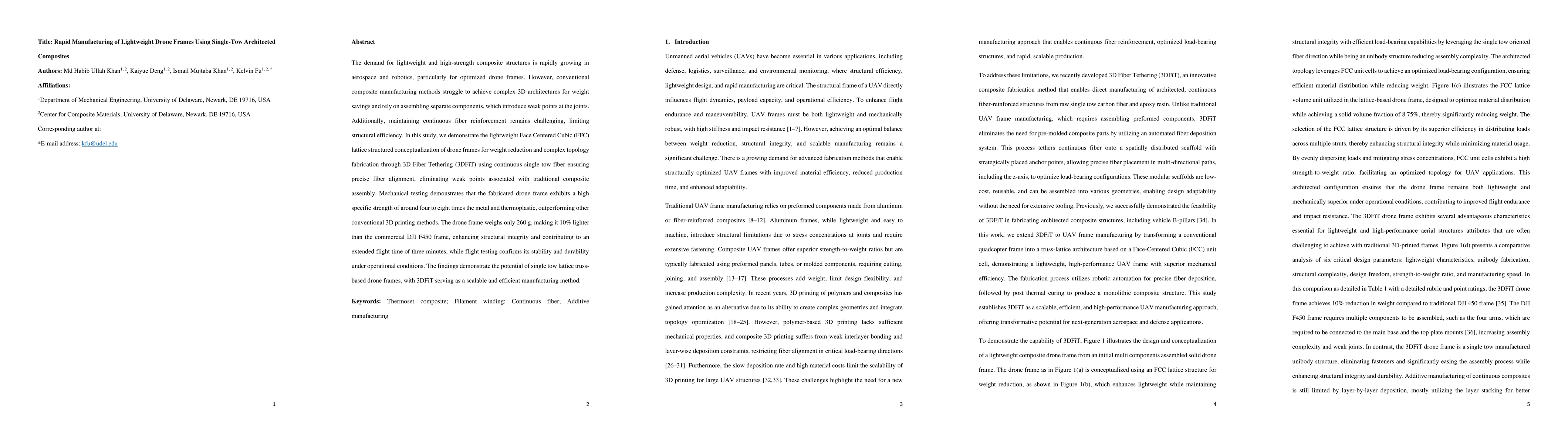 The demand for lightweight and high-strength composite structures is rapidly growing in aerospace and robotics, particularly for optimized drone frames. However, conventional composite manufacturing methods struggle to achieve complex 3D architectures for weight savings and rely on assembling separate components, which introduce weak points at the joints. Additionally, maintaining continuous fiber reinforcement remains challenging, limiting structural efficiency. In this study, we demonstrate the lightweight Face Centered Cubic (FFC) lattice structured conceptualization of drone frames for weight reduction and complex topology fabrication through 3D Fiber Tethering (3DFiT) using continuous single tow fiber ensuring precise fiber alignment, eliminating weak points associated with traditional composite assembly. Mechanical testing demonstrates that the fabricated drone frame exhibits a high specific strength of around four to eight times the metal and thermoplastic, outperforming other conventional 3D printing methods. The drone frame weighs only 260 g, making it 10% lighter than the commercial DJI F450 frame, enhancing structural integrity and contributing to an extended flight time of three minutes, while flight testing confirms its stability and durability under operational conditions. The findings demonstrate the potential of single tow lattice truss-based drone frames, with 3DFiT serving as a scalable and efficient manufacturing method.