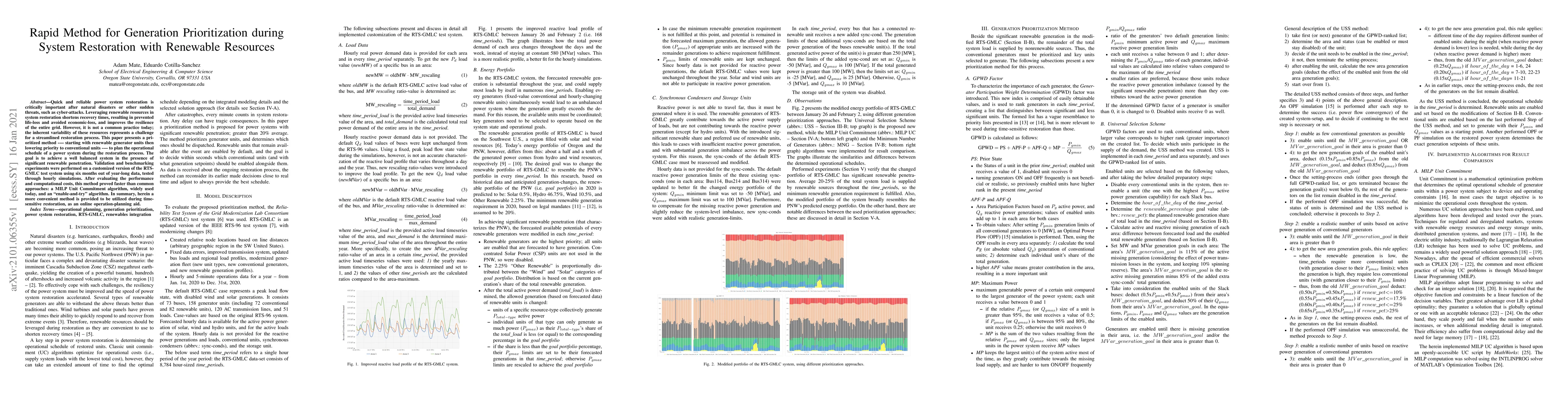 Quick and reliable power system restoration is critically important after natural disasters or other sudden threats, such as cyber-attacks. Leveraging renewable resources in system restoration shortens recovery times, resulting in prevented life-loss and avoided economic-loss, and improves the resilience of the entire grid. However, it is not a common practice today; the inherent variability of these resources represents a challenge for a streamlined restoration process. This paper presents a prioritized method - starting with renewable generator units then lowering priority to conventional units - to plan the operational schedule of a power system during the restoration process. The goal is to achieve a well balanced system in the presence of significant renewable penetration. Validation and benchmarking experiments were performed on a customized version of the RTS-GMLC test system using six months out of year-long data, tested through hourly simulations. After evaluating the performance and computational costs, this method proved faster than common approaches: a MILP Unit Commitment algorithm, widely used today, and an "enable-and-try" algorithm. In summary, herein a more convenient method is provided to be utilized during time-sensitive restoration, as an online operation-planning aid.