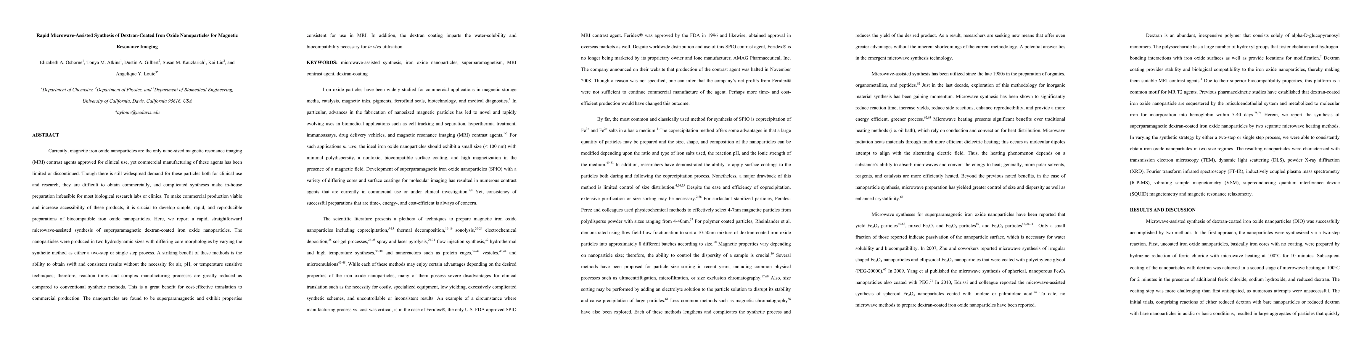 This paper describes a rapid microwave-assisted synthesis method for creating superparamagnetic dextran-coated iron oxide nanoparticles suitable for MRI, significantly reducing reaction times and complexity compared to conventional methods, thus enhancing commercial feasibility and accessibility. The method produces consistent nanoparticles with desired hydrodynamic sizes and core morphologies.