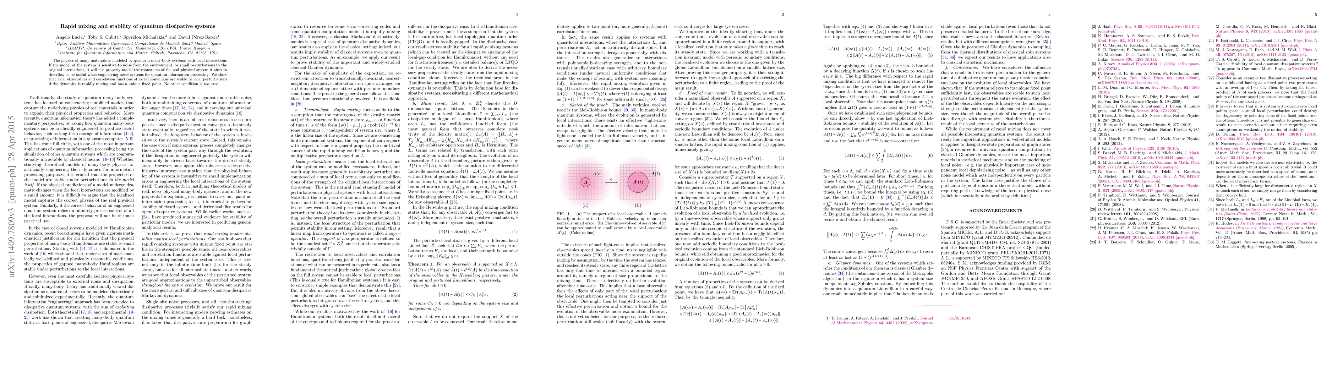 This paper demonstrates that local observables and correlation functions of quantum many-body systems remain stable under local perturbations if the system exhibits rapid mixing dynamics with a unique fixed point. This stability enhances the robustness of the model for real-world applications.