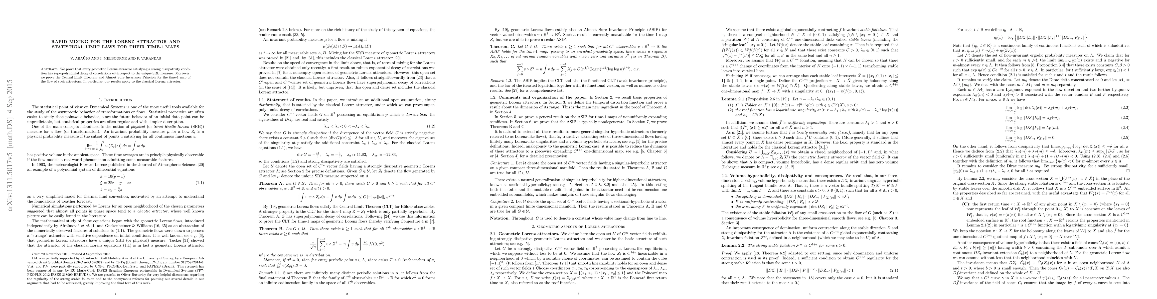This research proves superpolynomial decay of correlations for geometric Lorenz attractors' SRB measures. It also establishes the Central Limit Theorem and Almost Sure Invariance Principle for time-1 maps of their flows, applicable to classical Lorenz attractors.