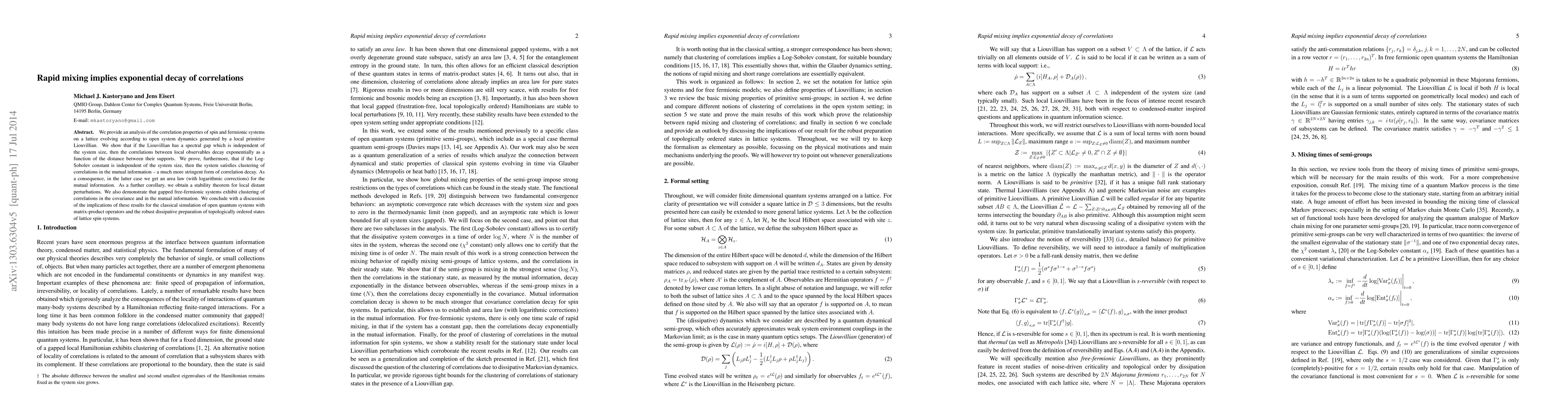 We provide an analysis of the correlation properties of spin and fermionic systems on a lattice evolving according to open system dynamics generated by a local primitive Liouvillian. We show that if the Liouvillian has a spectral gap which is independent of the system size, then the correlations between local observables decay exponentially as a function of the distance between their supports. We prove, furthermore, that if the Log-Sobolev constant is independent of the system size, then the system satisfies clustering of correlations in the mutual information - a much more stringent form of correlation decay. As a consequence, in the latter case we get an area law (with logarithmic corrections) for the mutual information. As a further corollary, we obtain a stability theorem for local distant perturbations. We also demonstrate that gapped free-fermionic systems exhibit clustering of correlations in the covariance and in the mutual information. We conclude with a discussion of the implications of these results for the classical simulation of open quantum systems with matrix-product operators and the robust dissipative preparation of topologically ordered states of lattice spin systems.