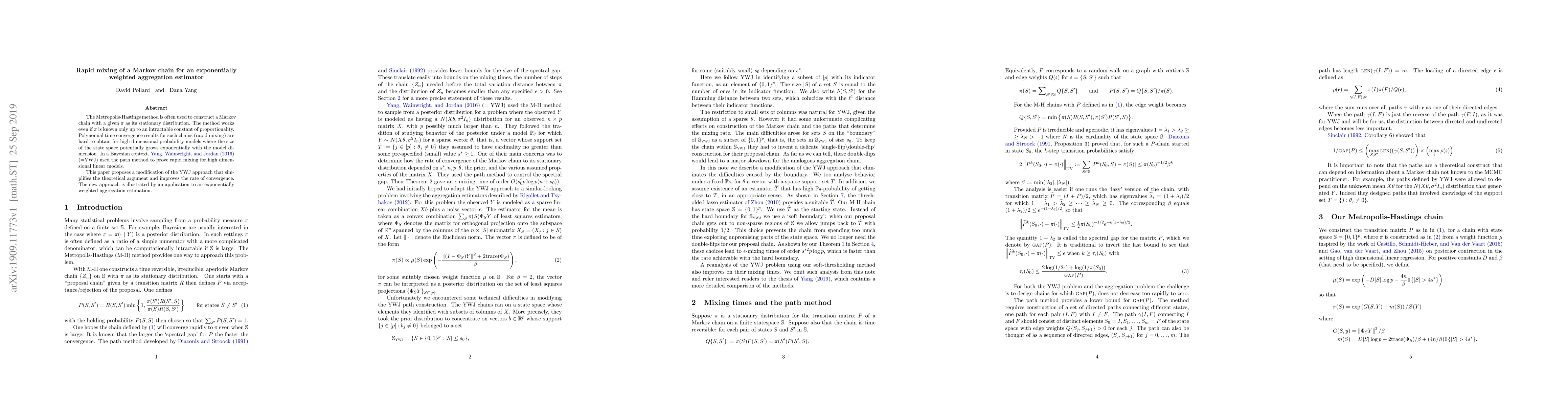 The Metropolis-Hastings method is often used to construct a Markov chain with a given $\pi$ as its stationary distribution. The method works even if $\pi$ is known only up to an intractable constant of proportionality. Polynomial time convergence results for such chains (rapid mixing) are hard to obtain for high dimensional probability models where the size of the state space potentially grows exponentially with the model dimension. In a Bayesian context, Yang, Wainwright, and Jordan (2016) (=YWJ) used the path method to prove rapid mixing for high dimensional linear models. This paper proposes a modification of the YWJ approach that simplifies the theoretical argument and improves the rate of convergence. The new approach is illustrated by an application to an exponentially weighted aggregation estimator.