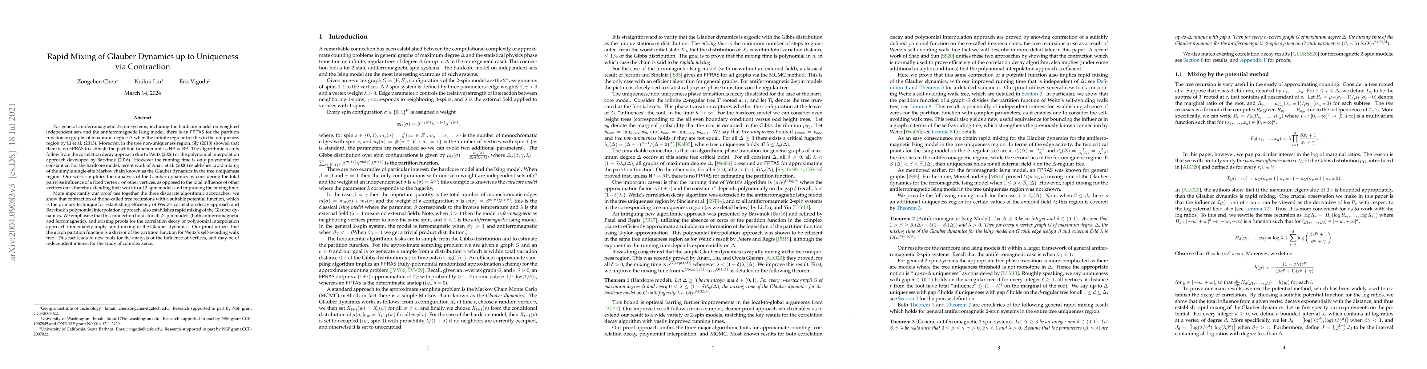 For general antiferromagnetic 2-spin systems, including the hardcore model and the antiferromagnetic Ising model, there is an $\mathsf{FPTAS}$ for the partition function on graphs of maximum degree $\Delta$ when the infinite regular tree lies in the uniqueness region by Li et al. (2013). Moreover, in the tree non-uniqueness region, Sly (2010) showed that there is no $\mathsf{FPRAS}$ to estimate the partition function unless $\mathsf{NP}=\mathsf{RP}$. The algorithmic results follow from the correlation decay approach due to Weitz (2006) or the polynomial interpolation approach developed by Barvinok (2016). However the running time is only polynomial for constant $\Delta$. For the hardcore model, recent work of Anari et al. (2020) establishes rapid mixing of the simple single-site Markov chain known as the Glauber dynamics in the tree uniqueness region. Our work simplifies their analysis of the Glauber dynamics by considering the total pairwise influence of a fixed vertex $v$ on other vertices, as opposed to the total influence on $v$, thereby extending their work to all 2-spin models and improving the mixing time. More importantly our proof ties together the three disparate algorithmic approaches: we show that contraction of the tree recursions with a suitable potential function, which is the primary technique for establishing efficiency of Weitz's correlation decay approach and Barvinok's polynomial interpolation approach, also establishes rapid mixing of the Glauber dynamics. We emphasize that this connection holds for all 2-spin models (both antiferromagnetic and ferromagnetic), and existing proofs for correlation decay or polynomial interpolation immediately imply rapid mixing of Glauber dynamics. Our proof utilizes that the graph partition function divides that of Weitz's self-avoiding walk trees, leading to new tools for analyzing influence of vertices.