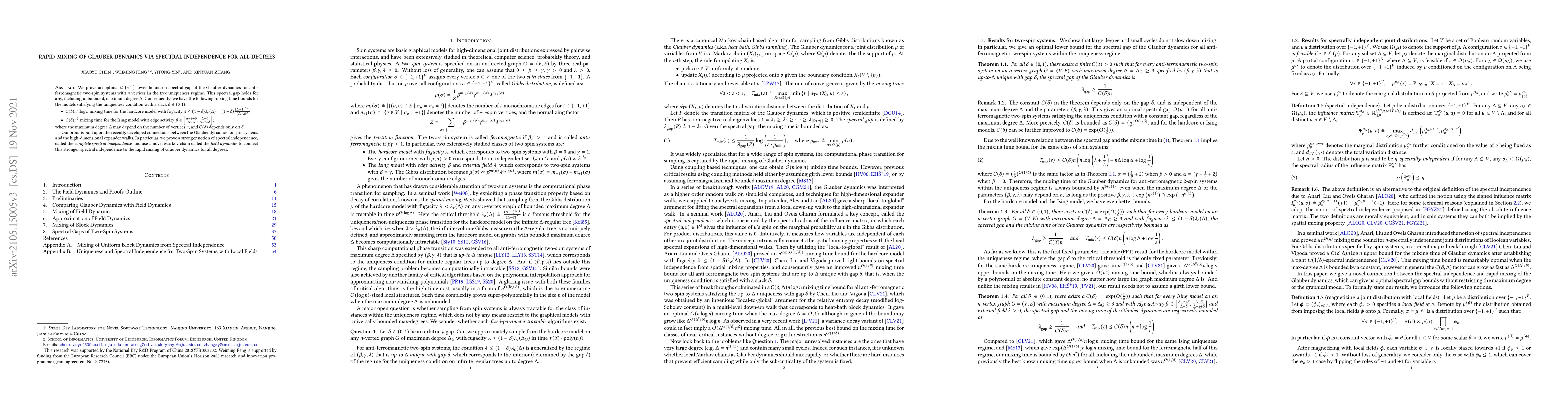 We prove an optimal $\Omega(n^{-1})$ lower bound on the spectral gap of Glauber dynamics for anti-ferromagnetic two-spin systems with $n$ vertices in the tree uniqueness regime. This spectral gap holds for all, including unbounded, maximum degree $\Delta$. Consequently, we have the following mixing time bounds for the models satisfying the uniqueness condition with a slack $\delta\in(0,1)$: $\bullet$ $C(\delta) n^2\log n$ mixing time for the hardcore model with fugacity $\lambda\le (1-\delta)\lambda_c(\Delta)= (1-\delta)\frac{(\Delta - 1)^{\Delta - 1}}{(\Delta - 2)^\Delta}$; $\bullet$ $C(\delta) n^2$ mixing time for the Ising model with edge activity $\beta\in\left[\frac{\Delta-2+\delta}{\Delta-\delta},\frac{\Delta-\delta}{\Delta-2+\delta}\right]$; where the maximum degree $\Delta$ may depend on the number of vertices $n$, and $C(\delta)$ depends only on $\delta$. Our proof is built upon the recently developed connections between the Glauber dynamics for spin systems and the high-dimensional expander walks. In particular, we prove a stronger notion of spectral independence, called the complete spectral independence, and use a novel Markov chain called the field dynamics to connect this stronger spectral independence to the rapid mixing of Glauber dynamics for all degrees.