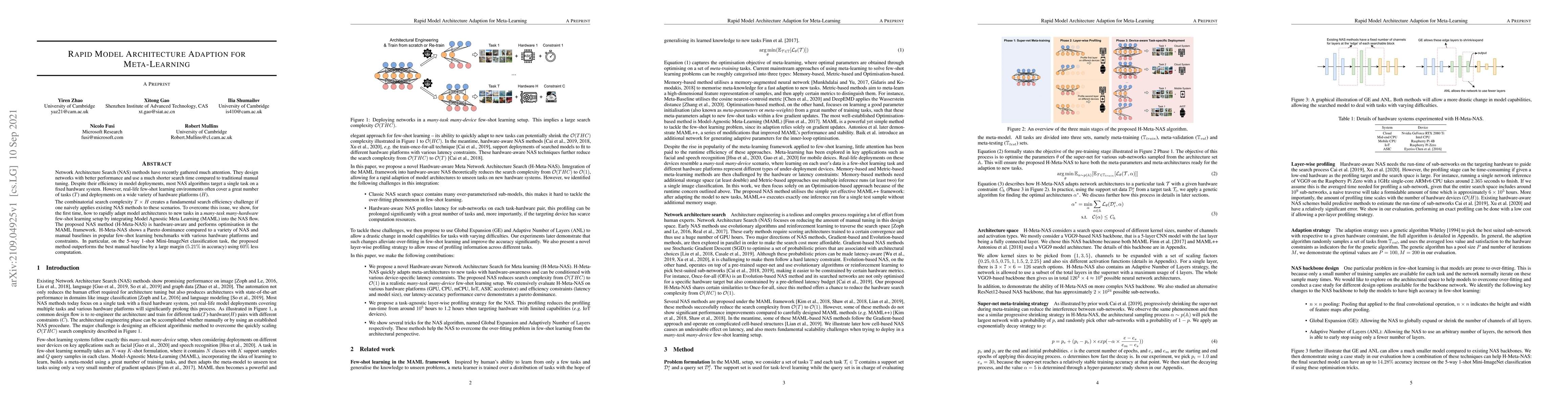 Network Architecture Search (NAS) methods have recently gathered much attention. They design networks with better performance and use a much shorter search time compared to traditional manual tuning. Despite their efficiency in model deployments, most NAS algorithms target a single task on a fixed hardware system. However, real-life few-shot learning environments often cover a great number of tasks (T ) and deployments on a wide variety of hardware platforms (H ). The combinatorial search complexity T times H creates a fundamental search efficiency challenge if one naively applies existing NAS methods to these scenarios. To overcome this issue, we show, for the first time, how to rapidly adapt model architectures to new tasks in a many-task many-hardware few-shot learning setup by integrating Model Agnostic Meta Learning (MAML) into the NAS flow. The proposed NAS method (H-Meta-NAS) is hardware-aware and performs optimisation in the MAML framework. H-Meta-NAS shows a Pareto dominance compared to a variety of NAS and manual baselines in popular few-shot learning benchmarks with various hardware platforms and constraints. In particular, on the 5-way 1-shot Mini-ImageNet classification task, the proposed method outperforms the best manual baseline by a large margin (5.21% in accuracy) using 60% less computation.