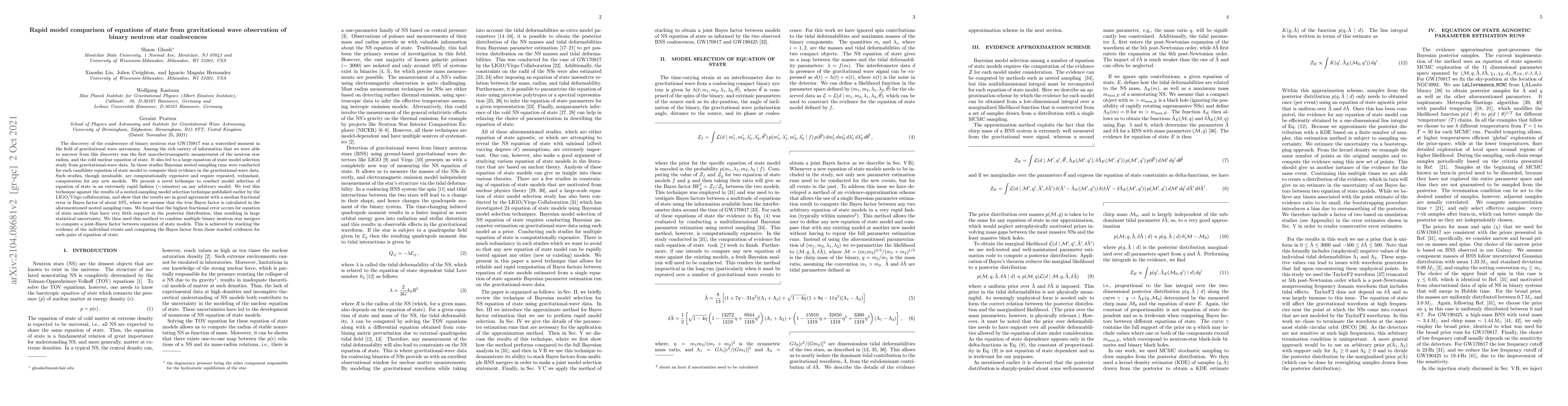 This paper introduces a rapid model comparison technique for equations of state from gravitational wave observations of binary neutron star coalescences, achieving results in minutes compared to hours or days with traditional methods. The technique shows good agreement with previous nested sampling results, with a median fractional error of 10% in Bayes factor calculations.