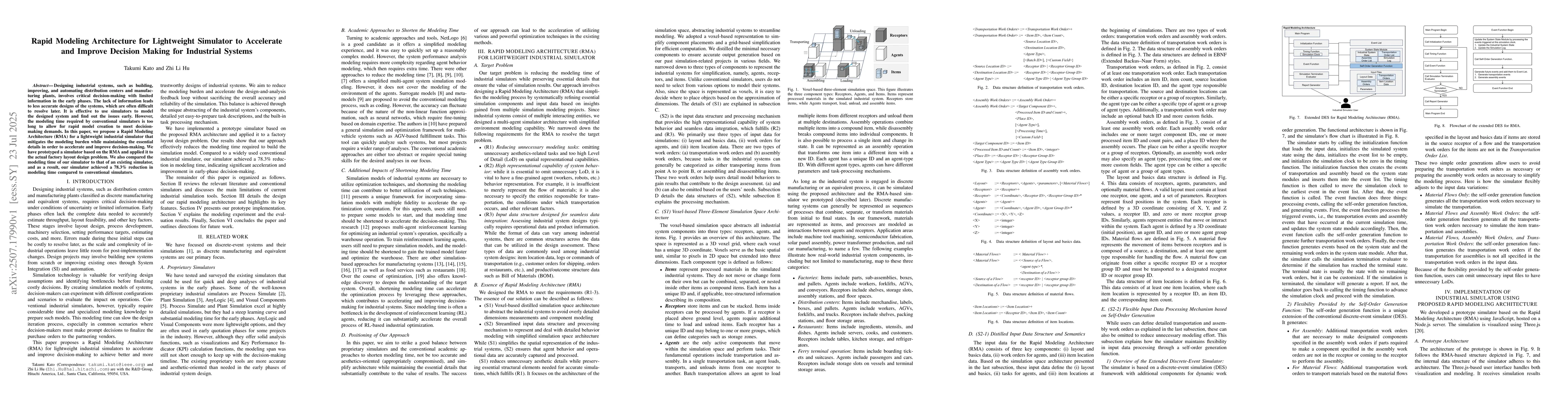 Designing industrial systems, such as building, improving, and automating distribution centers and manufacturing plants, involves critical decision-making with limited information in the early phases. The lack of information leads to less accurate designs of the systems, which are often difficult to resolve later. It is effective to use simulators to model the designed system and find out the issues early. However, the modeling time required by conventional simulators is too long to allow for rapid model creation to meet decision-making demands. In this paper, we propose a Rapid Modeling Architecture (RMA) for a lightweight industrial simulator that mitigates the modeling burden while maintaining the essential details in order to accelerate and improve decision-making. We have prototyped a simulator based on the RMA and applied it to the actual factory layout design problem. We also compared the modeling time of our simulator to that of an existing simulator, and as a result, our simulator achieved a 78.3% reduction in modeling time compared to conventional simulators.