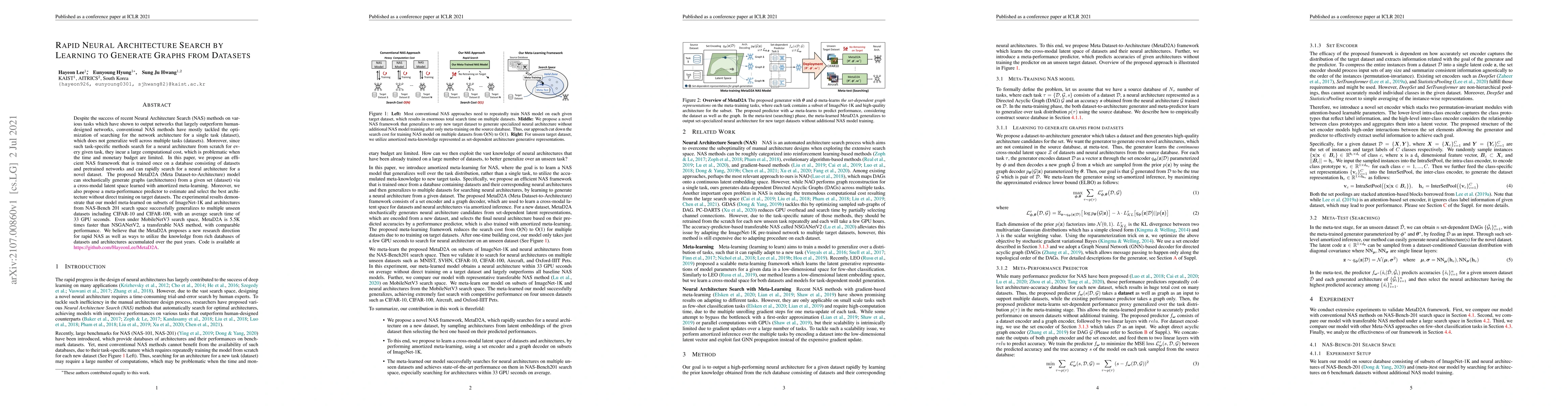 This paper proposes MetaD2A, an efficient Neural Architecture Search (NAS) framework that learns to generate neural architectures from datasets via a cross-modal latent space, enabling rapid search for novel datasets. The model, trained once on a database of pretrained networks, generalizes to unseen datasets with significantly reduced search time compared to existing methods.