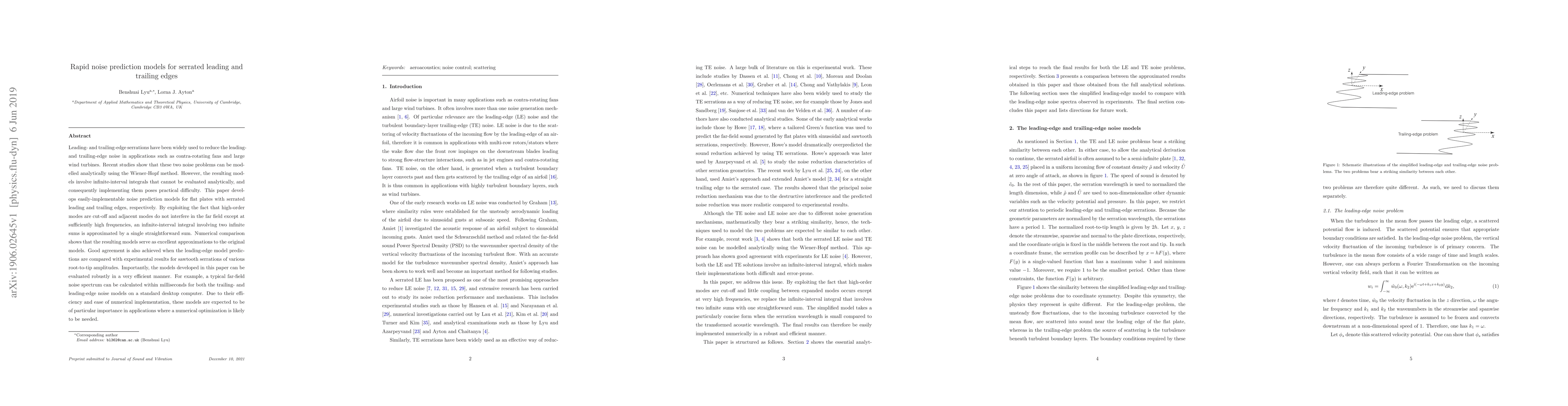 Researchers developed efficient noise prediction models for serrated leading and trailing edges in flat plates, achieving good agreement with experimental results and offering a practical solution for applications requiring numerical optimization.
