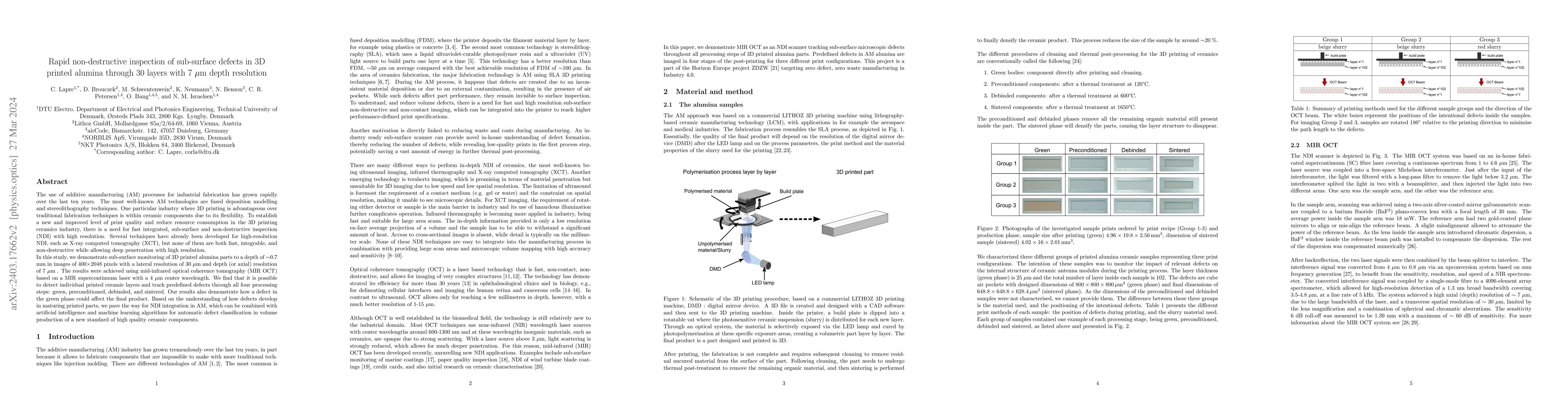 This paper introduces mid-infrared optical coherence tomography (MIR OCT) for rapid, non-destructive inspection of sub-surface defects in 3D printed alumina, achieving a depth resolution of 7 μm and monitoring through all processing stages. The technique paves the way for integrating NDI in additive manufacturing to enhance quality control in ceramic components.