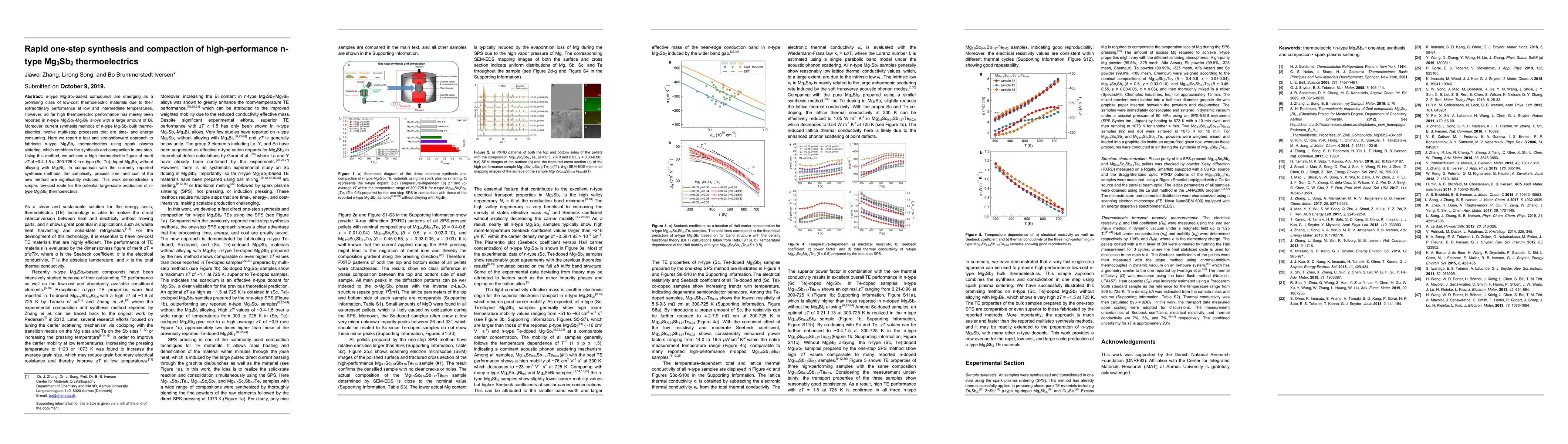 The research introduces a rapid, one-step method using spark plasma sintering to synthesize and compact n-type Mg3Sb2 thermoelectric materials, achieving a high thermoelectric figure of merit zT of ~0.4-1.5 at 300-725 K. This method eliminates the need for multi-step processes, simplifying production and potentially reducing costs for large-scale manufacturing.