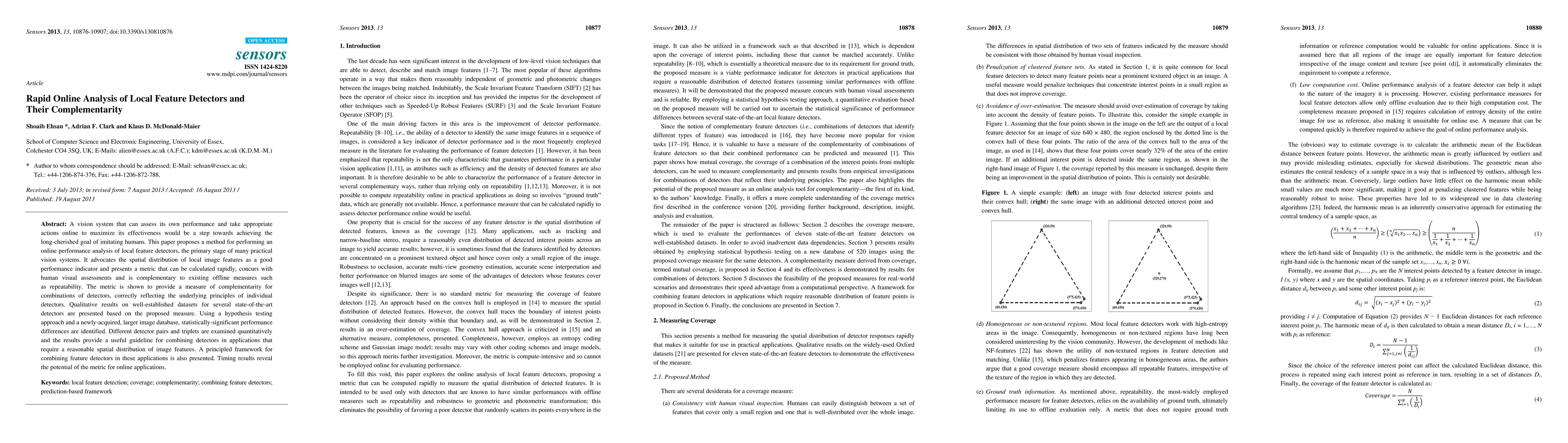 A vision system that can assess its own performance and take appropriate actions online to maximize its effectiveness would be a step towards achieving the long-cherished goal of imitating humans. This paper proposes a method for performing an online performance analysis of local feature detectors, the primary stage of many practical vision systems. It advocates the spatial distribution of local image features as a good performance indicator and presents a metric that can be calculated rapidly, concurs with human visual assessments and is complementary to existing offline measures such as repeatability. The metric is shown to provide a measure of complementarity for combinations of detectors, correctly reflecting the underlying principles of individual detectors. Qualitative results on well-established datasets for several state-of-the-art detectors are presented based on the proposed measure. Using a hypothesis testing approach and a newly-acquired, larger image database, statistically-significant performance differences are identified. Different detector pairs and triplets are examined quantitatively and the results provide a useful guideline for combining detectors in applications that require a reasonable spatial distribution of image features. A principled framework for combining feature detectors in these applications is also presented. Timing results reveal the potential of the metric for online applications.