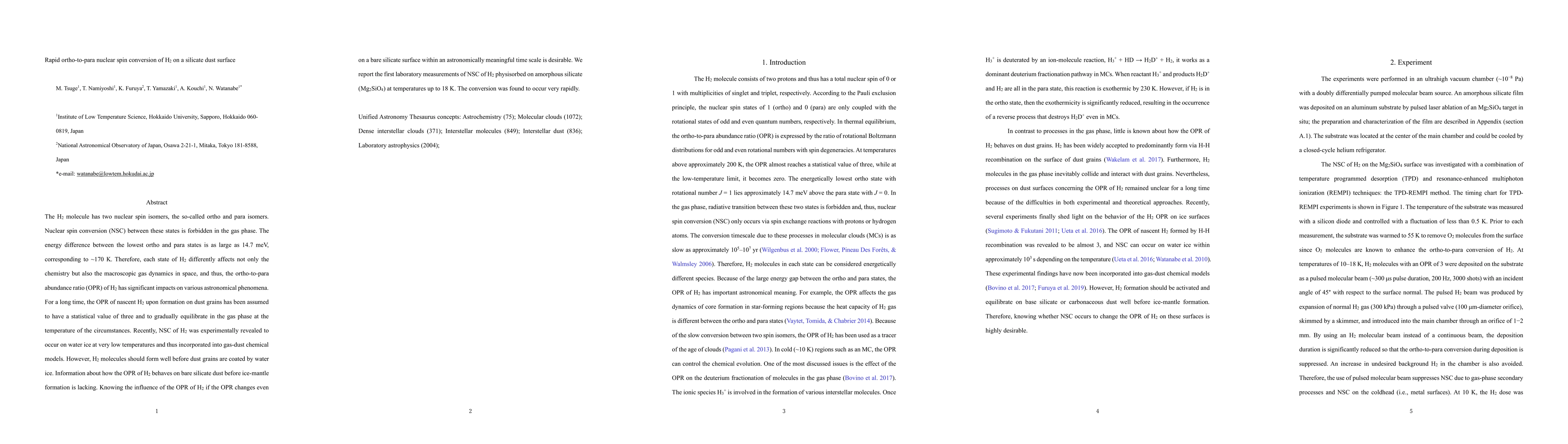 This paper reports rapid ortho-to-para nuclear spin conversion of H2 on amorphous silicate dust surfaces at temperatures up to 18 K, challenging the assumption that H2 ortho-to-para ratio equilibrates only after ice formation. This discovery has implications for understanding the chemistry and dynamics of H2 in space.