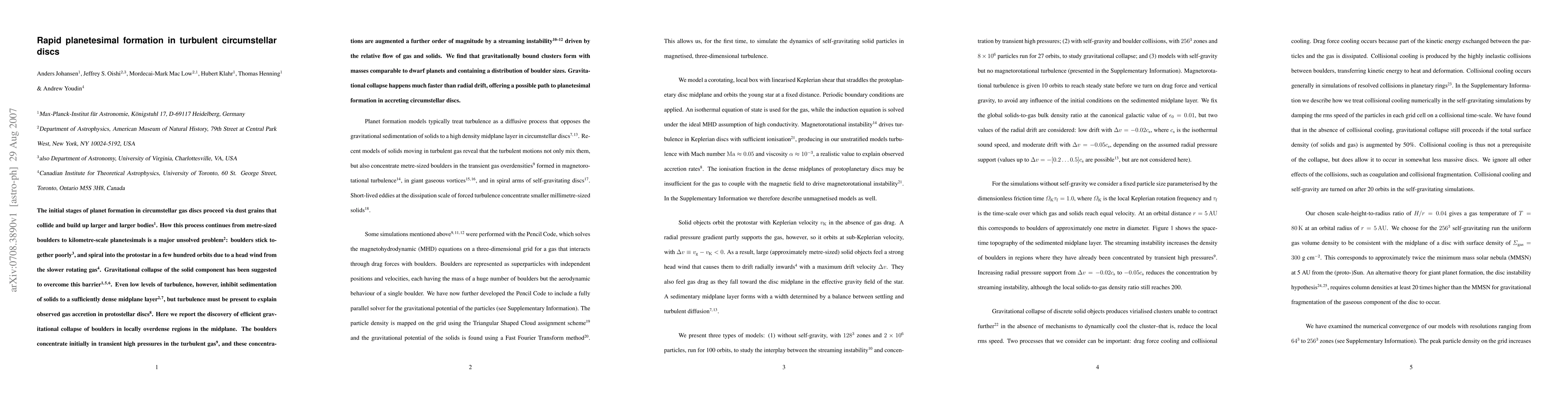 This paper proposes a rapid mechanism for planetesimal formation in turbulent circumstellar discs through gravitational collapse in overdense regions, driven by a streaming instability, which forms clusters comparable to dwarf planets. This process overcomes the barriers of slow radial drift and poor boulder cohesion.