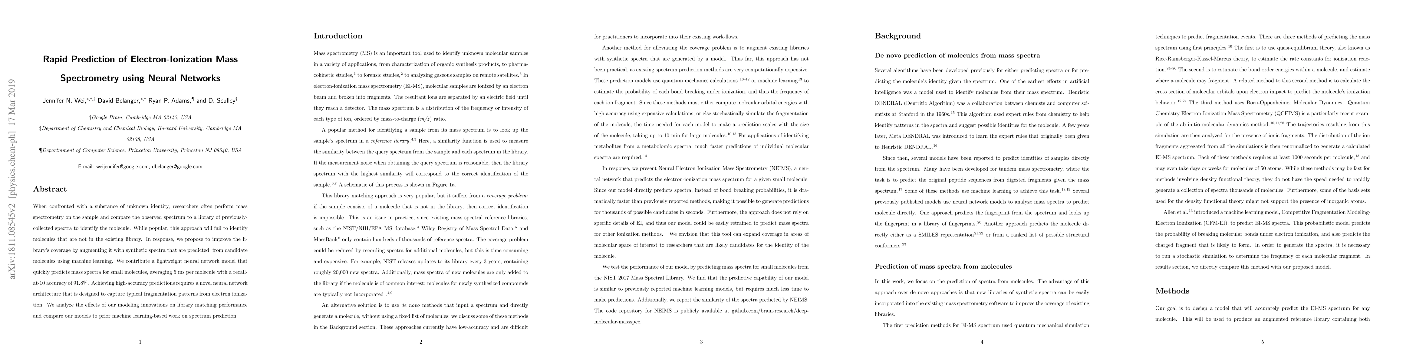 When confronted with a substance of unknown identity, researchers often perform mass spectrometry on the sample and compare the observed spectrum to a library of previously-collected spectra to identify the molecule. While popular, this approach will fail to identify molecules that are not in the existing library. In response, we propose to improve the library's coverage by augmenting it with synthetic spectra that are predicted using machine learning. We contribute a lightweight neural network model that quickly predicts mass spectra for small molecules. Achieving high accuracy predictions requires a novel neural network architecture that is designed to capture typical fragmentation patterns from electron ionization. We analyze the effects of our modeling innovations on library matching performance and compare our models to prior machine learning-based work on spectrum prediction.