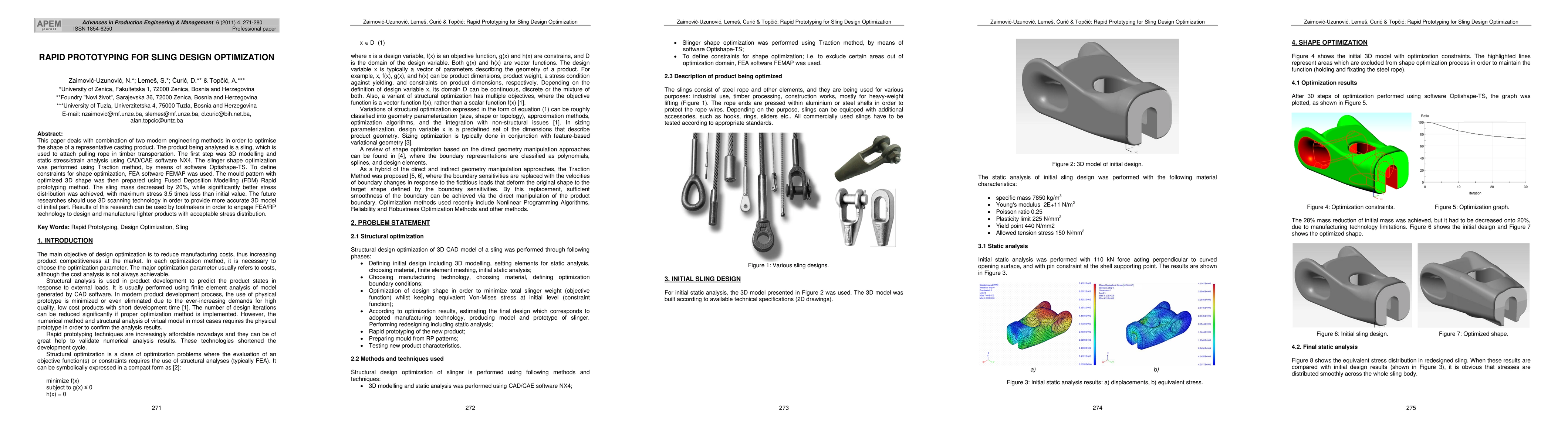 This paper optimizes the design of a timber transportation sling using CAD/CAE and rapid prototyping, achieving a 20% mass reduction and improved stress distribution. Future work should incorporate 3D scanning for more precise models.