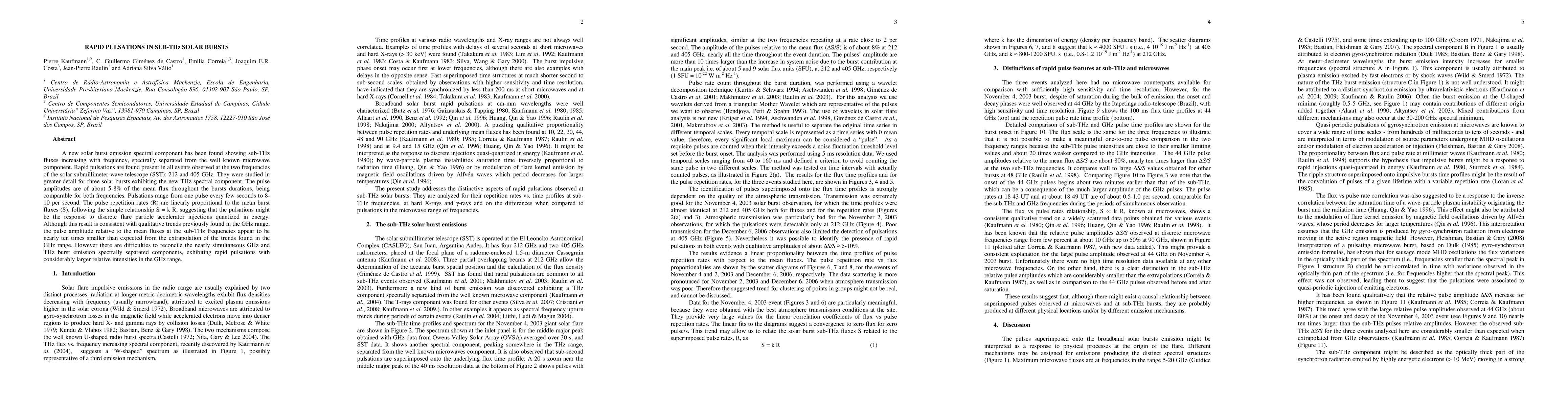 A new solar burst emission spectral component has been found showing sub-THz fluxes increasing with frequency, spectrally separated from the well known microwave component. Rapid pulsations are found present in all events observed at the two frequencies of the solar submillimeter-wave telescope (SST): 212 and 405 GHz. They were studied in greater detail for three solar bursts exhibiting the new THz spectral component. The pulse amplitudes are of about 5-8% of the mean flux throughout the bursts durations, being comparable for both frequencies. Pulsations range from one pulse every few seconds to 8-10 per second. The pulse repetition rates (R) are linearly proportional to the mean burst fluxes (S), following the simple relationship S = k R, suggesting that the pulsations might be the response to discrete flare particle accelerator injections quantized in energy. Although this result is consistent with qualitative trends previously found in the GHz range, the pulse amplitude relative to the mean fluxes at the sub-THz frequencies appear to be nearly ten times smaller than expected from the extrapolation of the trends found in the GHz range. However there are difficulties to reconcile the nearly simultaneous GHz and THz burst emission spectrally separated components, exhibiting rapid pulsations with considerably larger relative intensities in the GHz range.