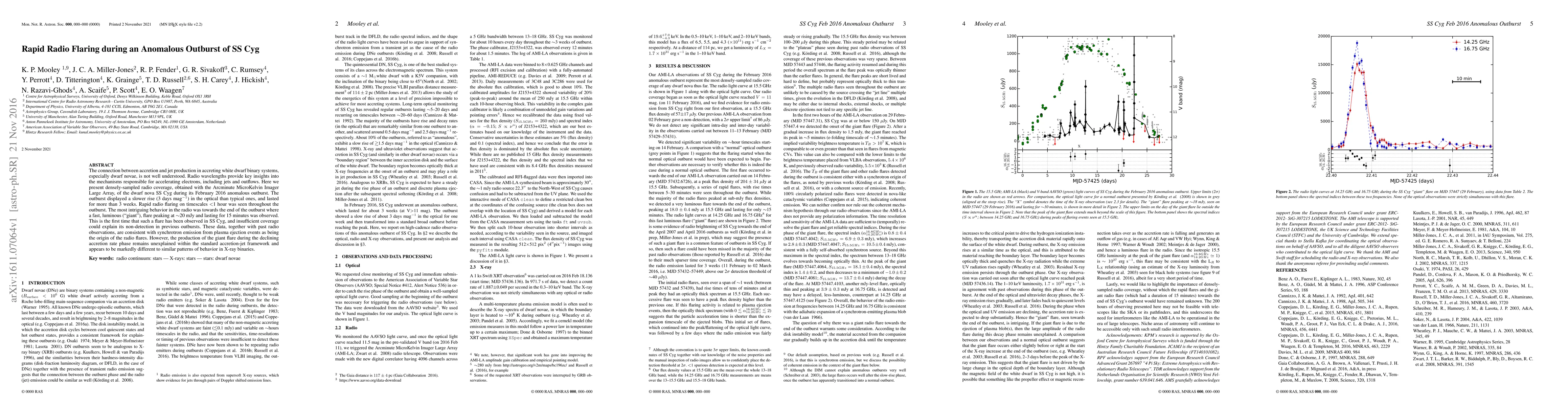 This paper reports on the first observation of rapid radio flaring during an anomalous outburst of the dwarf nova SS Cyg in February 2016, including a unique giant flare, suggesting synchrotron emission from plasma ejection events. The giant flare's occurrence during declining accretion challenges existing models of accretion-jet dynamics.