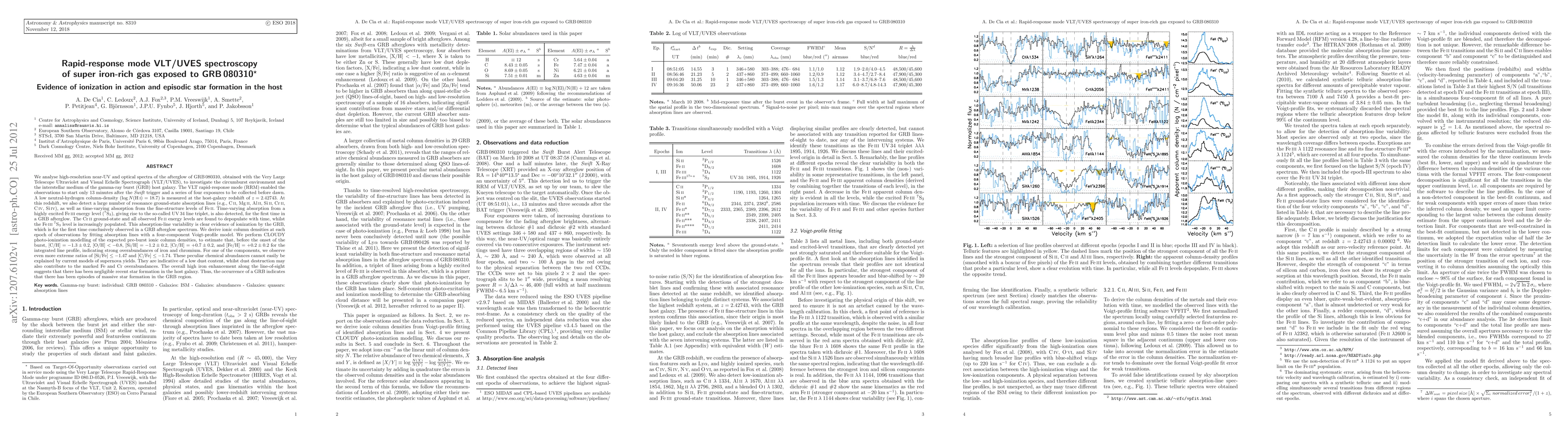 This study analyzes high-resolution spectra of GRB 080310 afterglow using VLT/UVES, revealing ionization by the GRB and episodic star formation. Key findings include detection of time-varying FeIII absorption, evidence of strong iron and chromium overabundances, and a low neutral-hydrogen column-density at the host galaxy redshift (z = 2.42743).