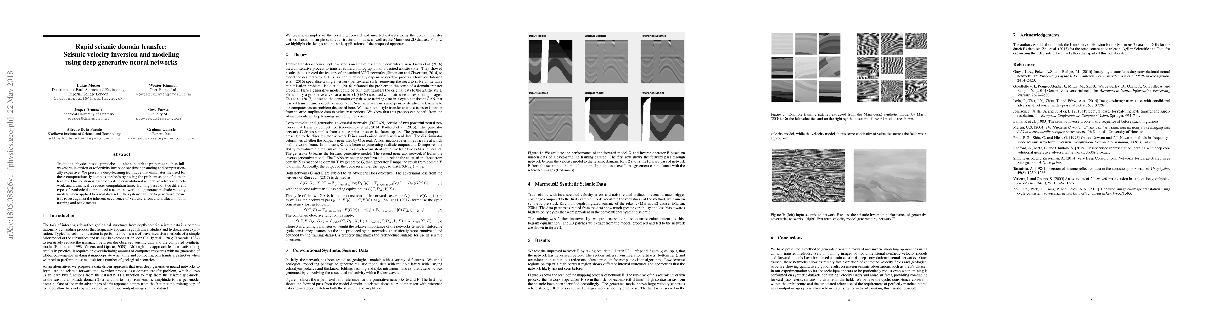 Traditional physics-based approaches to infer sub-surface properties such as full-waveform inversion or reflectivity inversion are time-consuming and computationally expensive. We present a deep-learning technique that eliminates the need for these computationally complex methods by posing the problem as one of domain transfer. Our solution is based on a deep convolutional generative adversarial network and dramatically reduces computation time. Training based on two different types of synthetic data produced a neural network that generates realistic velocity models when applied to a real dataset. The system's ability to generalize means it is robust against the inherent occurrence of velocity errors and artifacts in both training and test datasets.