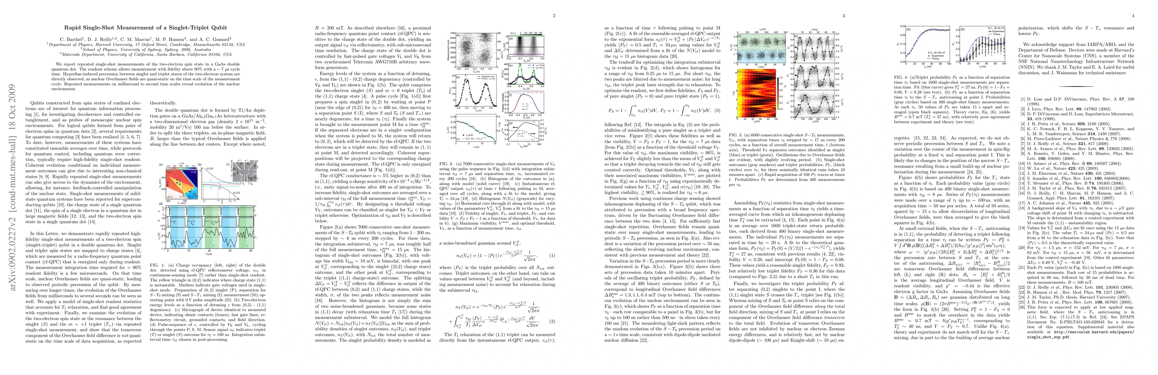 We report repeated single-shot measurements of the two-electron spin state in a GaAs double quantum dot. The readout scheme allows measurement with fidelity above 90% with a 7 microsecond cycle time. Hyperfine-induced precession between singlet and triplet states of the two-electron system are directly observed, as nuclear Overhauser fields are quasi-static on the time scale of the measurement cycle. Repeated measurements on millisecond to second time scales reveal evolution of the nuclear environment.