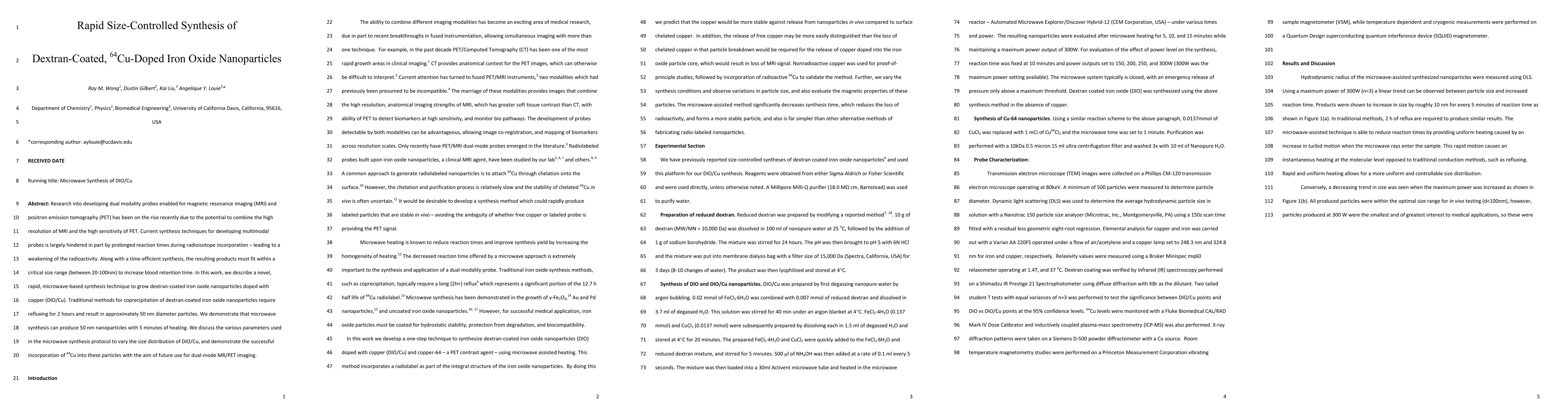 This research presents a rapid microwave-based method for synthesizing dextran-coated, 64Cu-doped iron oxide nanoparticles in 5 minutes, achieving size control within a critical range for extended blood retention. The method aims to improve dual-modality MRI/PET imaging probes by combining high-resolution imaging with high sensitivity.