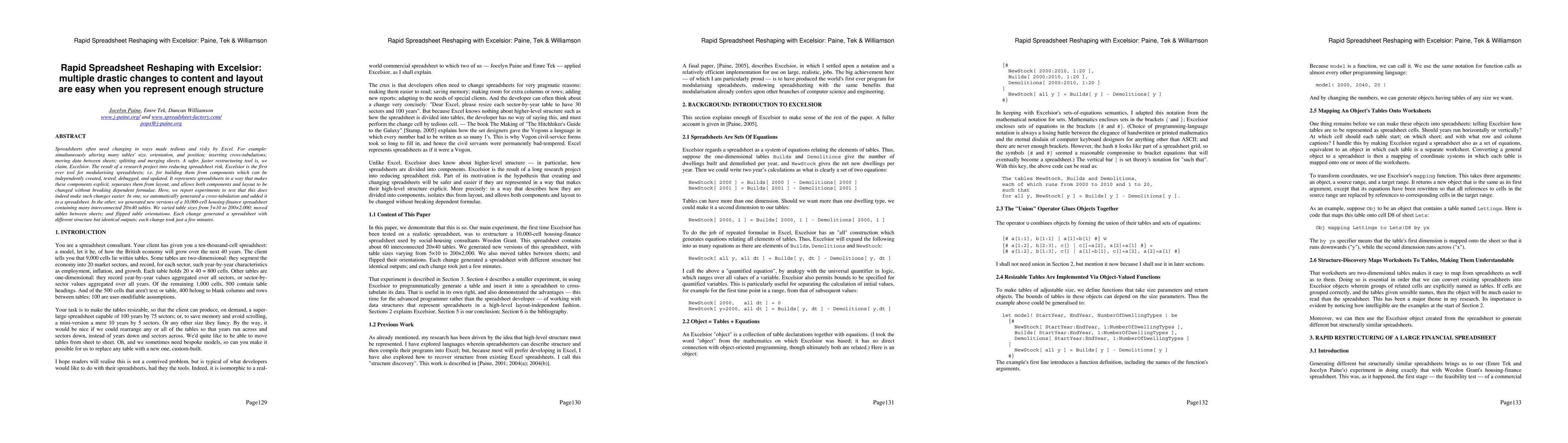 Spreadsheets often need changing in ways made tedious and risky by Excel. For example: simultaneously altering many tables' size, orientation, and position; inserting cross-tabulations; moving data between sheets; splitting and merging sheets. A safer, faster restructuring tool is, we claim, Excelsior. The result of a research project into reducing spreadsheet risk, Excelsior is the first ever tool for modularising spreadsheets; i.e. for building them from components which can be independently created, tested, debugged, and updated. It represents spreadsheets in a way that makes these components explicit, separates them from layout, and allows both components and layout to be changed without breaking dependent formulae. Here, we report experiments to test that this does indeed make such changes easier. In one, we automatically generated a cross-tabulation and added it to a spreadsheet. In the other, we generated new versions of a 10,000-cell housing-finance spreadsheet containing many interconnected 20*40 tables. We varied table sizes from 5*10 to 200*2,000; moved tables between sheets; and flipped table orientations. Each change generated a spreadsheet with different structure but identical outputs; each change took just a few minutes.