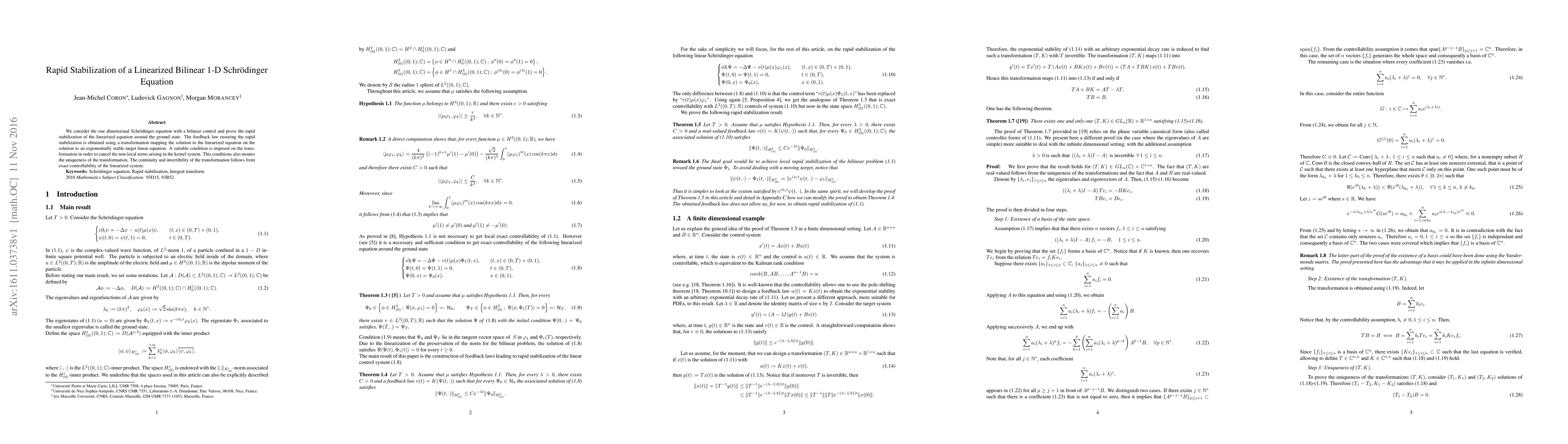 This paper proves rapid stabilization of the linearized bilinear $1-D$ Schrödinger equation around its ground state using a feedback law derived via a transformation that maps the solution to an exponentially stable target linear equation, ensuring cancellation of non-local terms and uniqueness of the transformation.