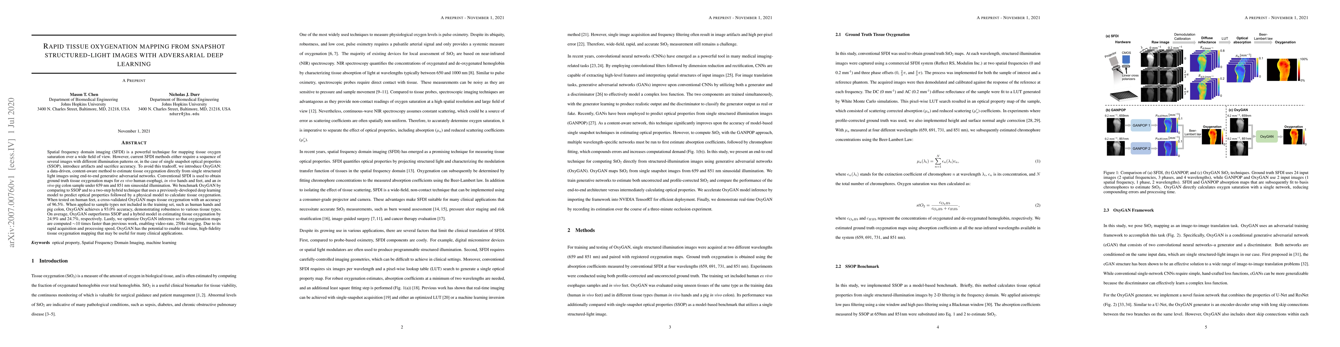 OxyGAN employs adversarial deep learning to rapidly map tissue oxygenation from single structured-light images, achieving 96.5% accuracy on human feet and 93.0% on unseen samples like human hands and pig colon, outperforming traditional methods by 24.9% and 24.7% respectively. It enables real-time imaging at 25Hz.