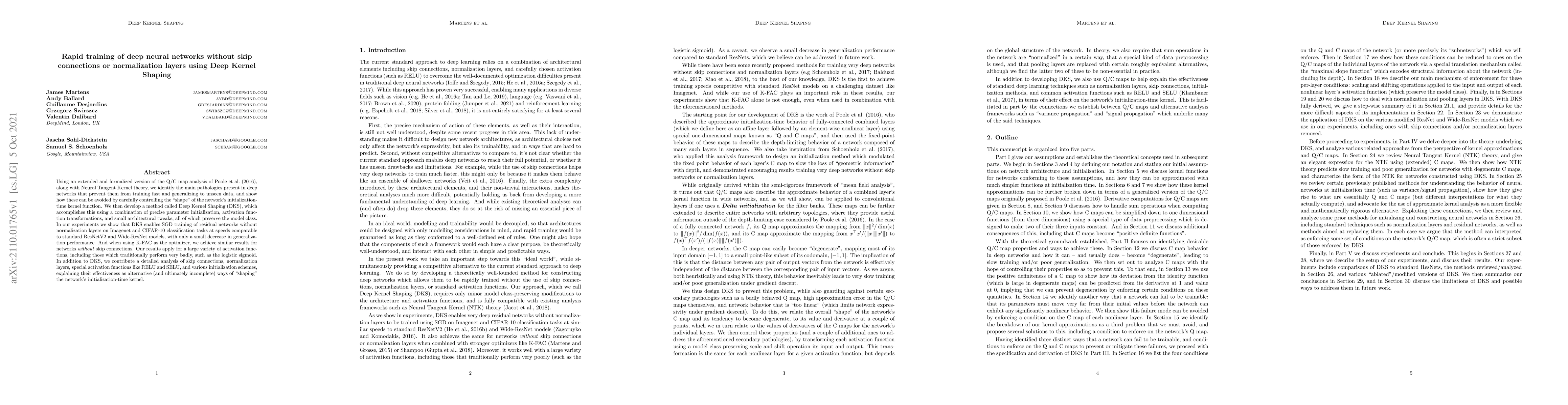 This paper proposes Deep Kernel Shaping (DKS) to rapidly train deep neural networks without skip connections or normalization layers by controlling the initialization-time kernel function. DKS achieves this through precise parameter initialization and activation function transformations, leading to fast training and comparable performance on ImageNet and CIFAR-10.