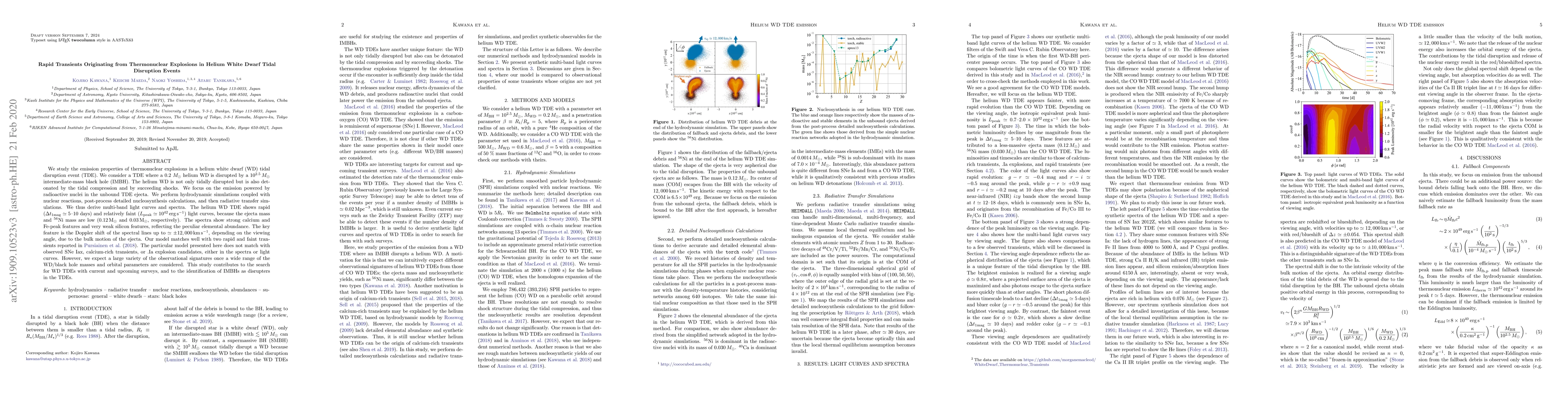 This paper investigates the emission properties of thermonuclear explosions in helium white dwarf tidal disruption events (TDEs) by an intermediate-mass black hole, deriving rapid and faint light curves and spectra powered by radioactive nuclei in the ejecta. The study finds that the transients exhibit strong calcium and Fe-peak features, with weak silicon, and Doppler shifts up to ±12,000 km/s due to ejecta motion.