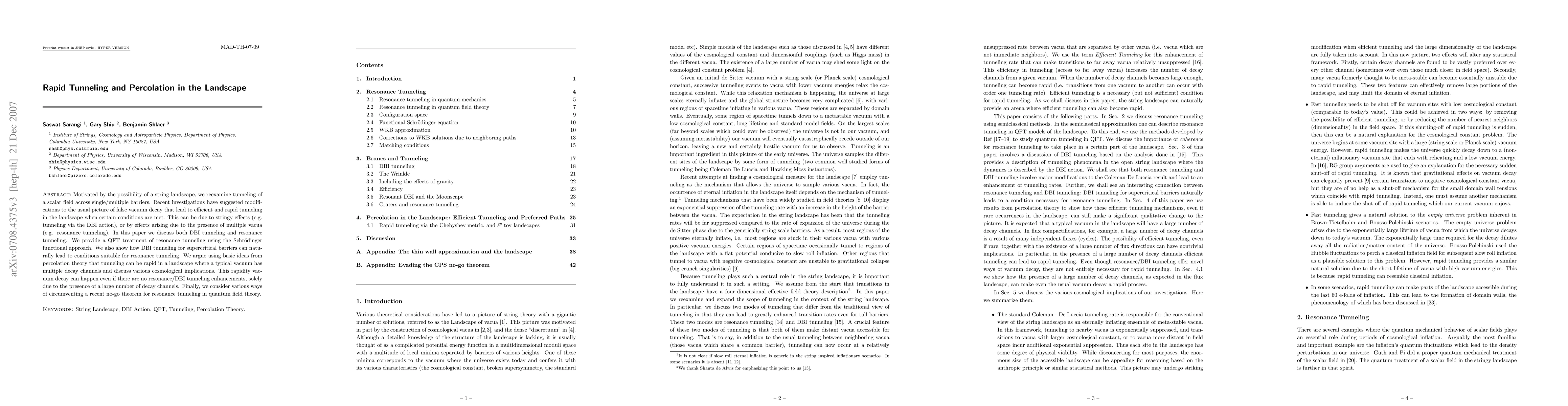 This paper explores rapid tunneling and percolation in a string landscape, focusing on both DBI and resonance tunneling mechanisms. It uses quantum field theory to analyze resonance tunneling and discusses how supercritical barriers can facilitate rapid decay even without enhancements, due to numerous decay channels.