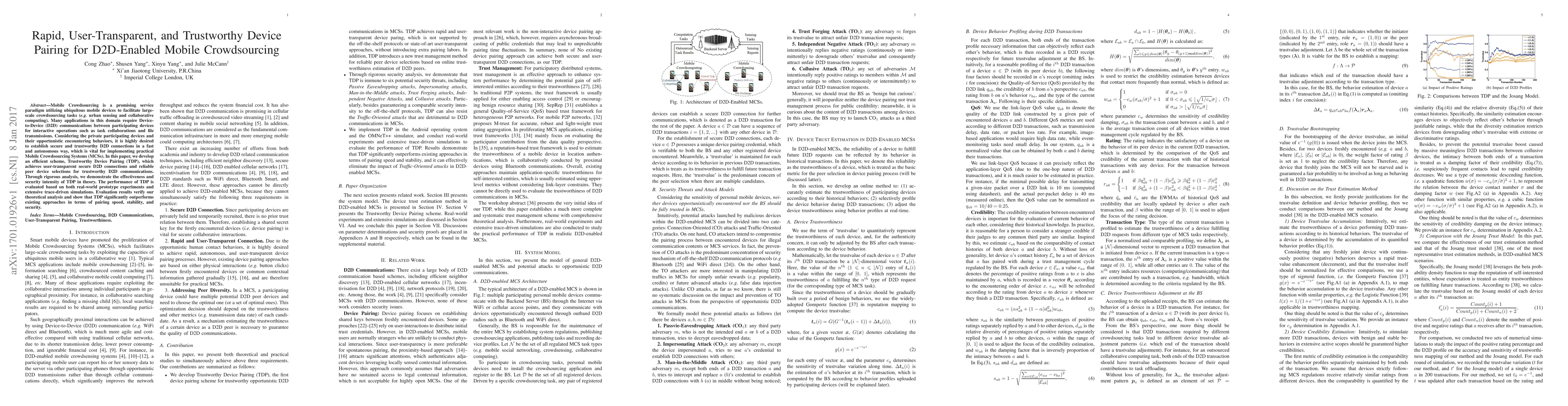 This paper proposes Trustworthy Device Pairing (TDP), an efficient scheme for secure and fast Device-to-Device (D2D) connections in Mobile Crowdsourcing Systems, achieving user-transparent pairing and reliable peer selection. The scheme's effectiveness and security are validated through theoretical analysis, real-world experiments, and simulations, demonstrating superior performance over existing methods.