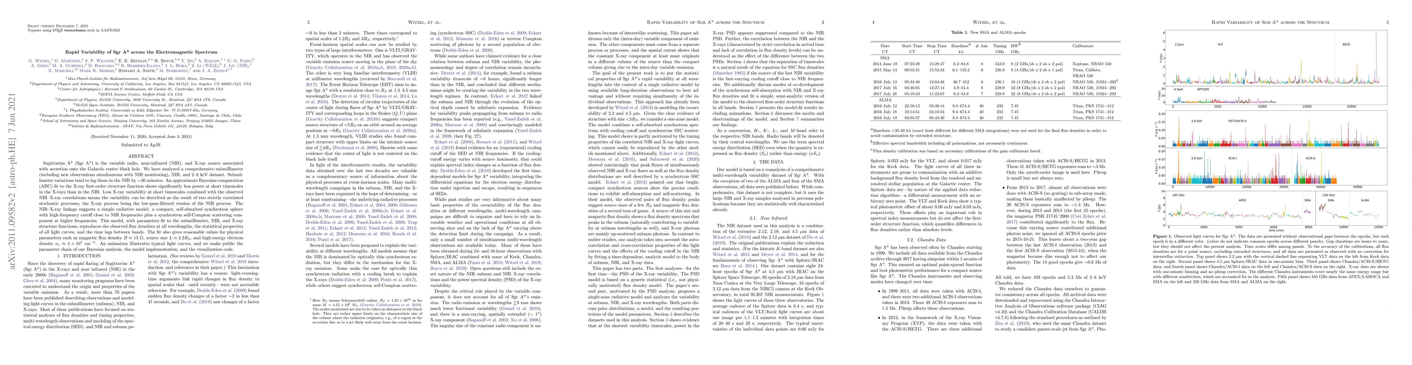 This paper analyzes the rapid variability of Sagittarius A* across radio, NIR, and X-ray wavelengths, finding that submillimeter variations lag NIR by about 30 minutes. The study proposes a radiative model involving a synchrotron sphere and synchrotron self-Compton scattering to explain the observed variability, fitting parameters such as magnetic flux density and electron density.