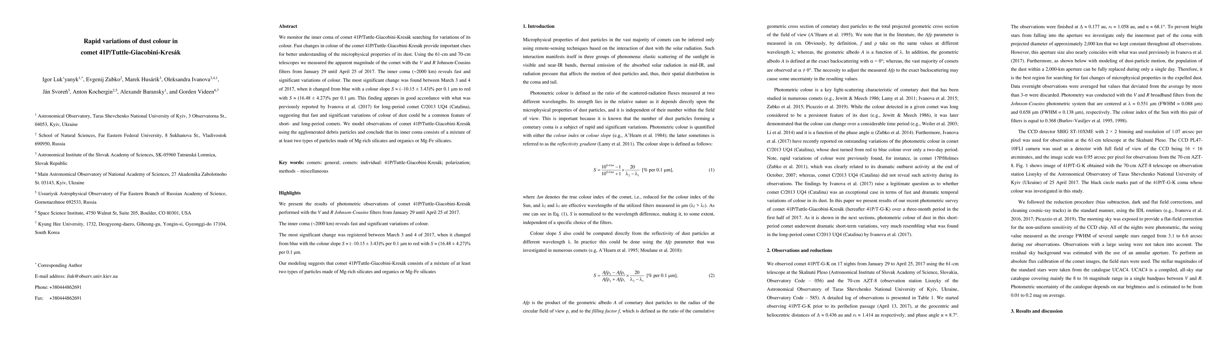 We monitor the inner coma of comet 41P/Tuttle-Giacobini-Kres\'{a}k searching for variations of its colour. Fast changes in colour of the comet 41P/Tuttle-Giacobini-Kres\'{a}k provide important clues for better understanding of the microphysical properties of its dust. Using the 61-cm and 70-cm telescopes we measured the apparent magnitude of the comet with the V and R Johnson-Cousins filters from January 29 until April 25 of 2017. The inner coma ({\sim} 2000 km) reveals fast and significant variations of colour. The most significant change was found between March 3 and 4 of 2017, when it changed from blue with a colour slope S {\approx}(-10.15 {\pm} 3.43){\%} per 0.1 {\mu}m to red with S {\approx} (16.48 {\pm} 4.27){\%} per 0.1 {\mu}m. This finding appears in good accordance with what was previously reported by Ivanova et al. (2017) for long-period comet C/2013 UQ4 (Catalina), suggesting that fast and significant variations of colour of dust could be a common feature of short- and long-period comets. We model observations of comet 41P/Tuttle-Giacobini-Kres\'{a}k using the agglomerated debris particles and conclude that its inner coma consists of a mixture of at least two types of particles made of Mg-rich silicates and organics or Mg-Fe silicates.